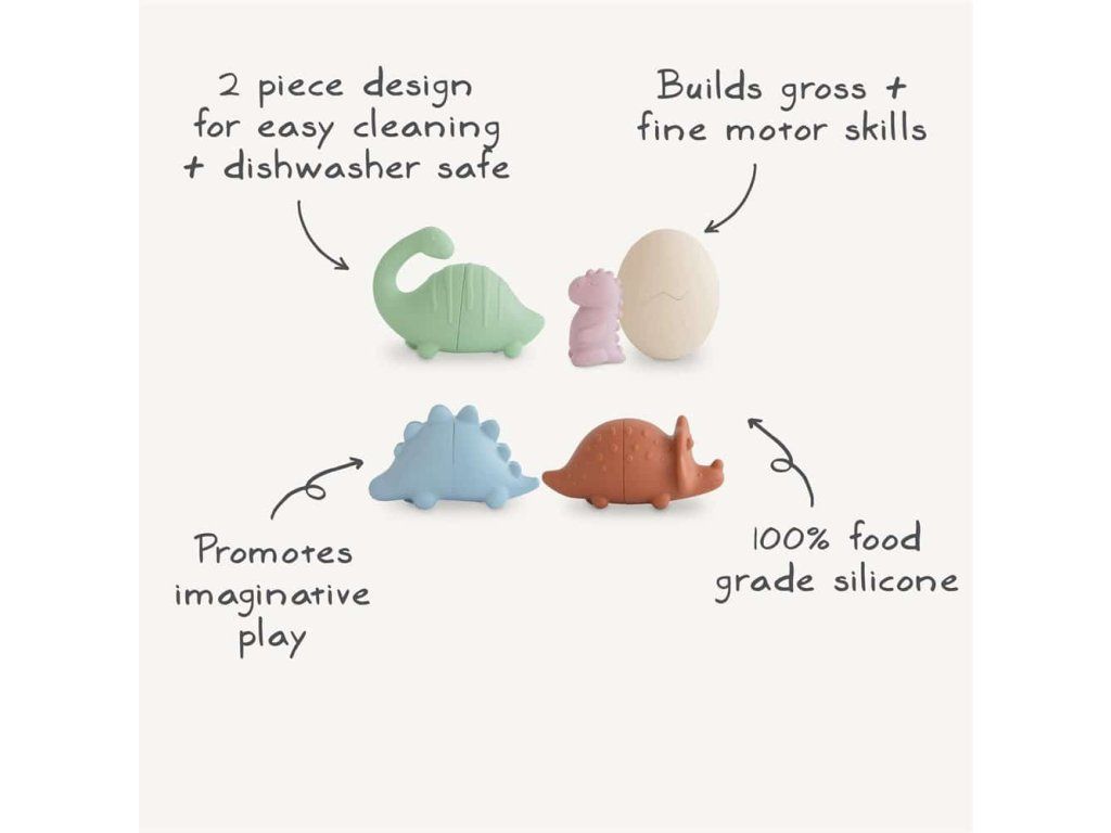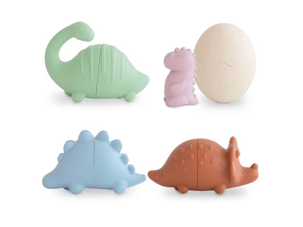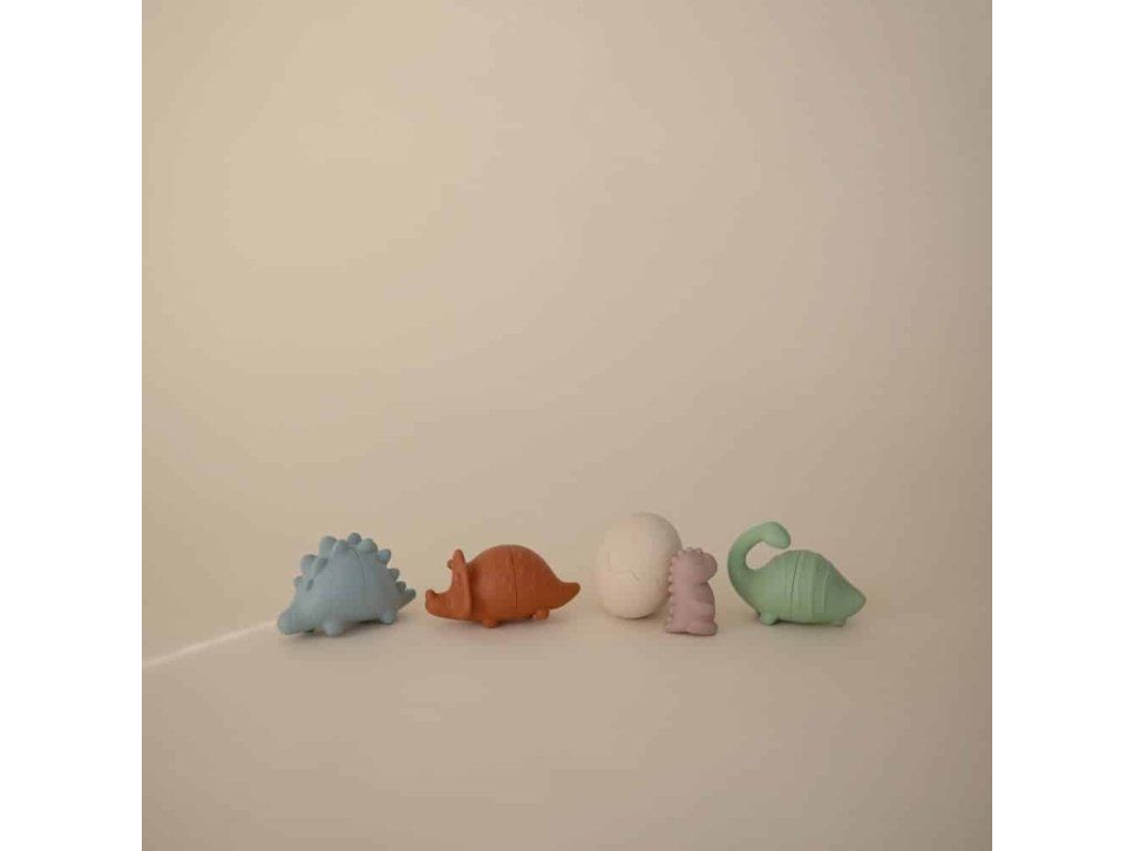 Súprava na hranie do kúpeľa Dinosaury je sada hračiek vhodných do vody, ktoré možno bezpečne používať vo vani. Obsahuje 4 malé figúrky inšpirované dinosaurami, vyrobené z potravinárskeho silikónu. Sú navrhnuté tak, aby stimulovali zmysly detí a podporovali ich kognitívny rozvoj.