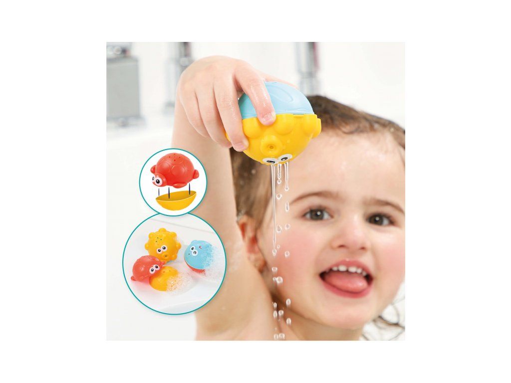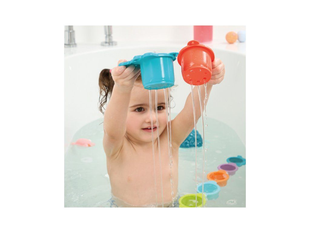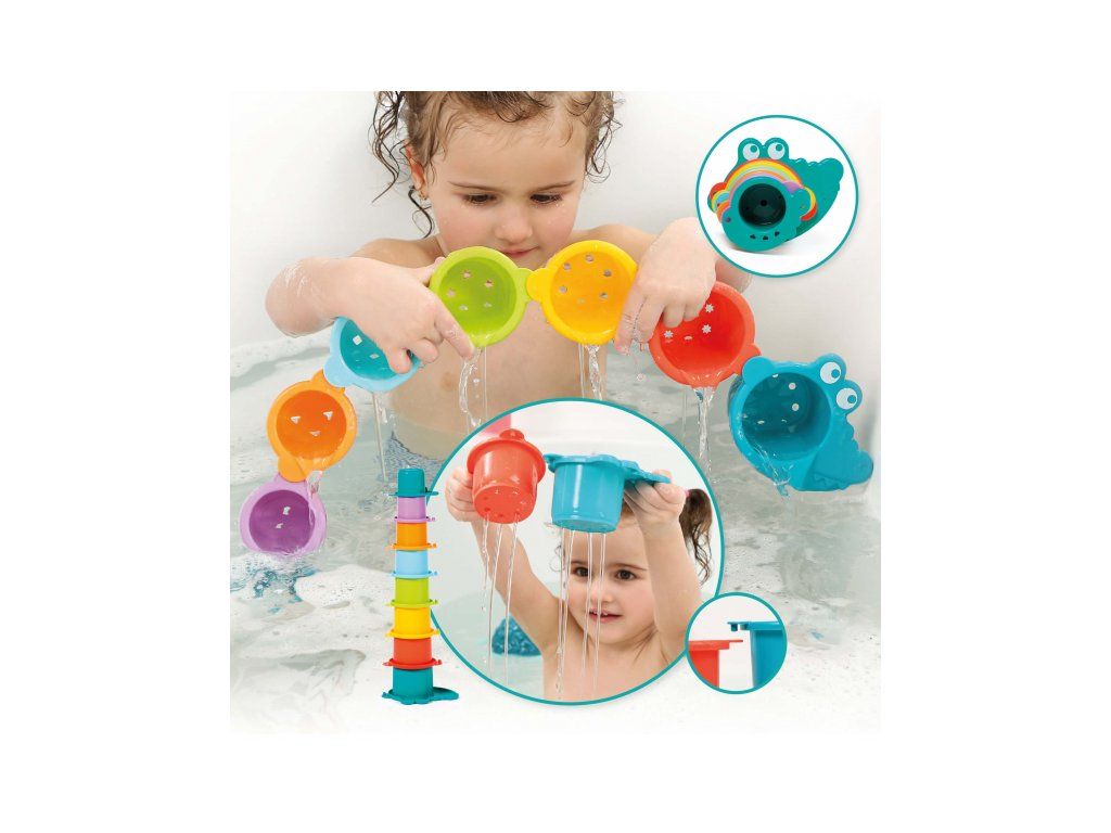 - Zábavu dopĺňa striekací krab, lodička a krokodíl so sadou 8 stohovateľných téglikov, ideálnych pre vodné experimenty a efekty dažďa