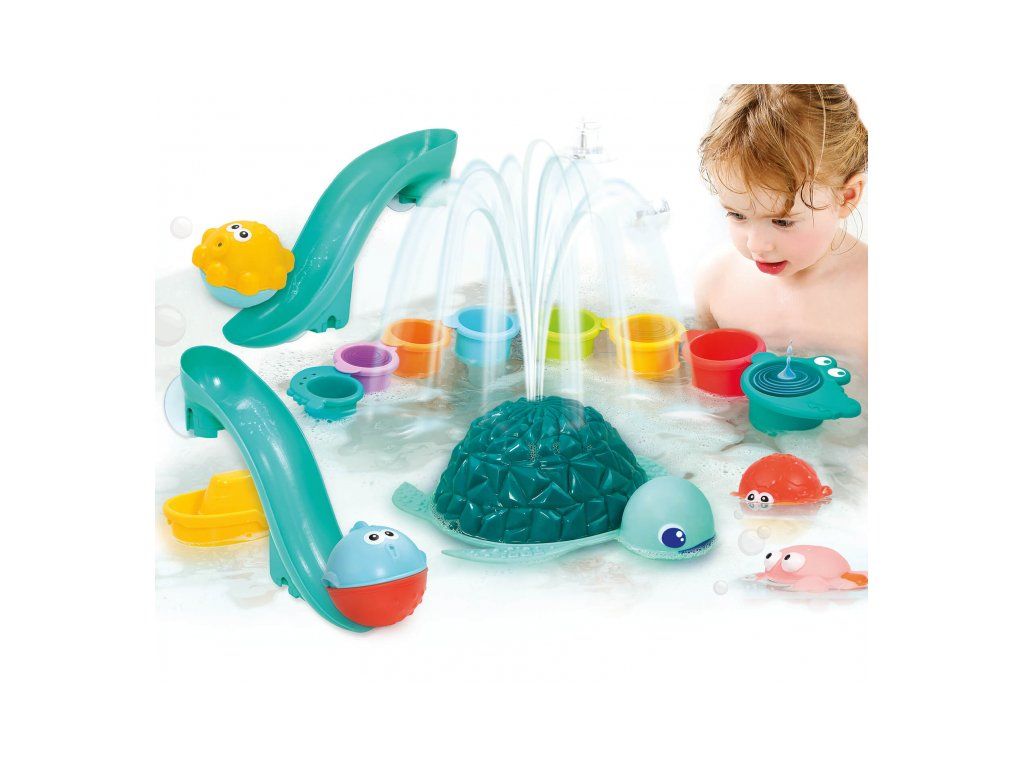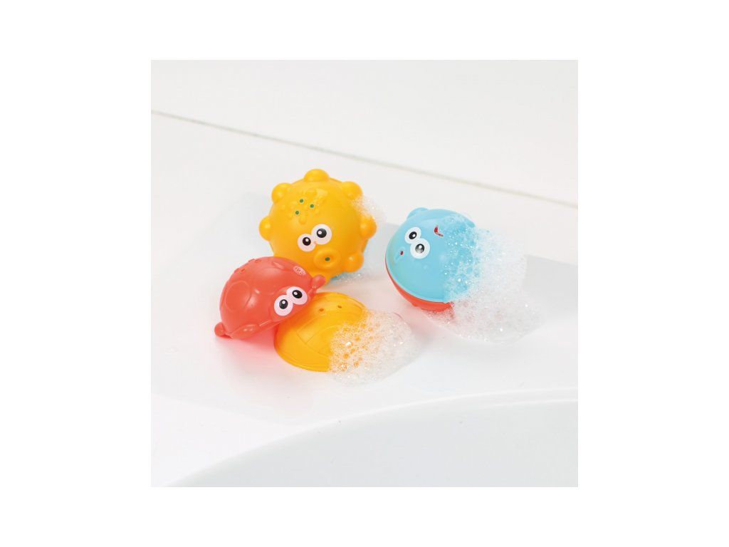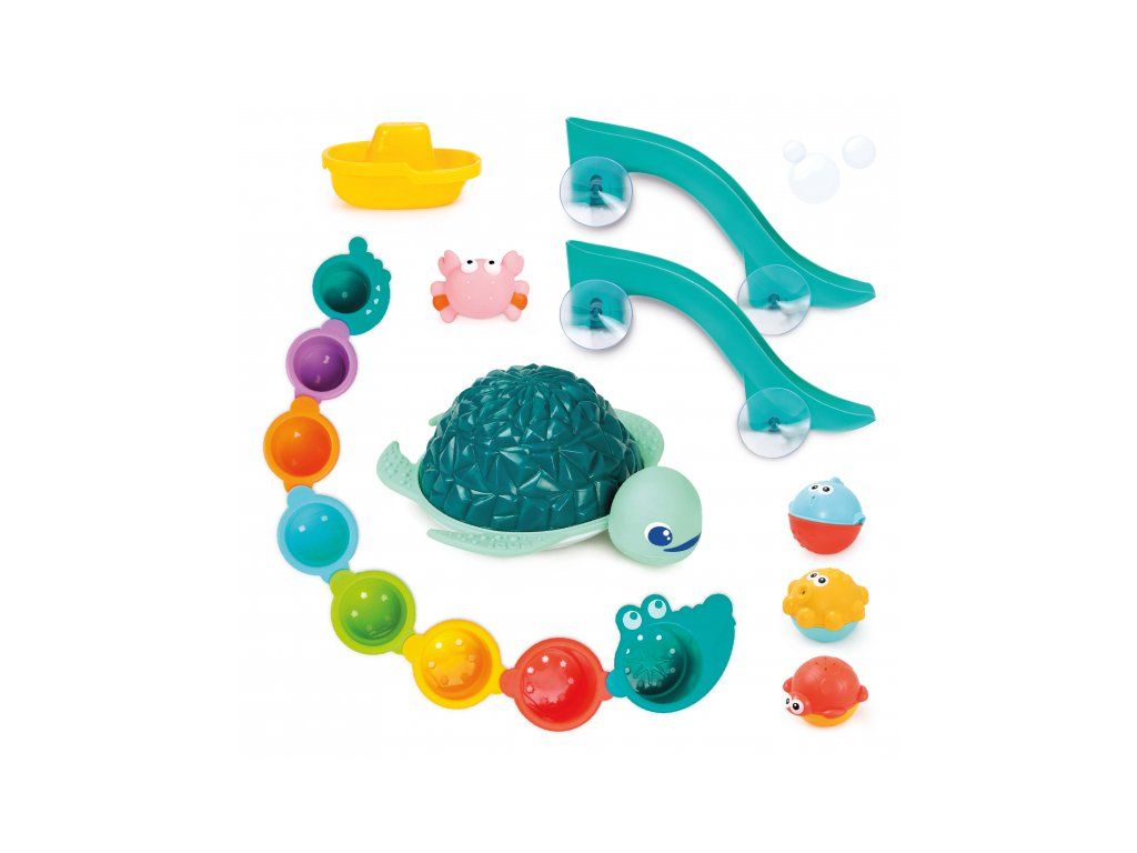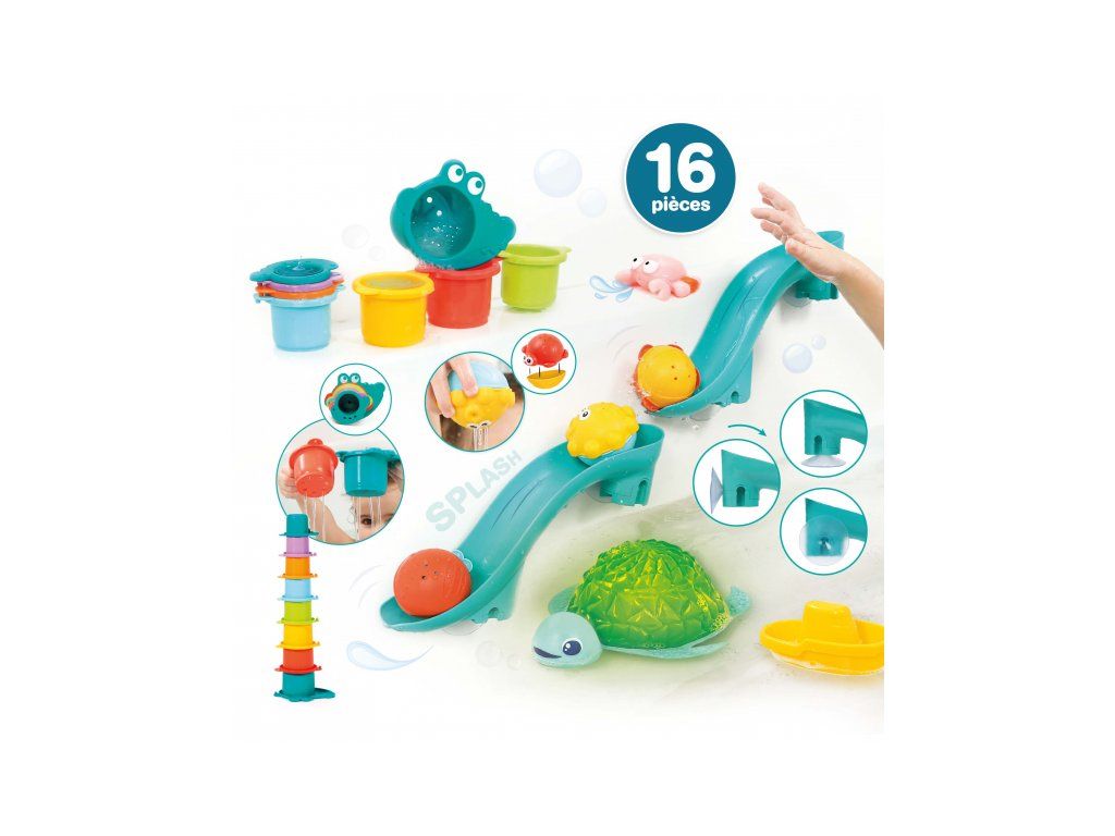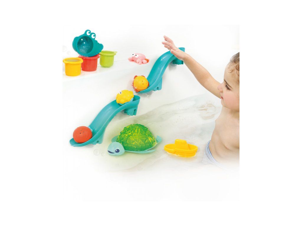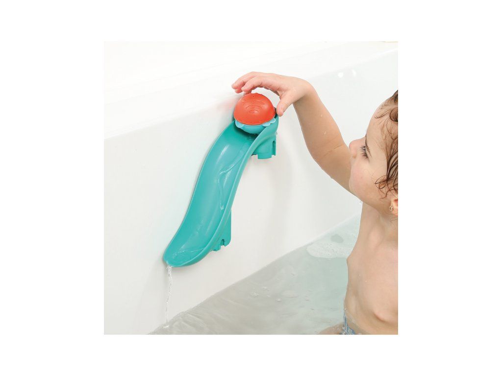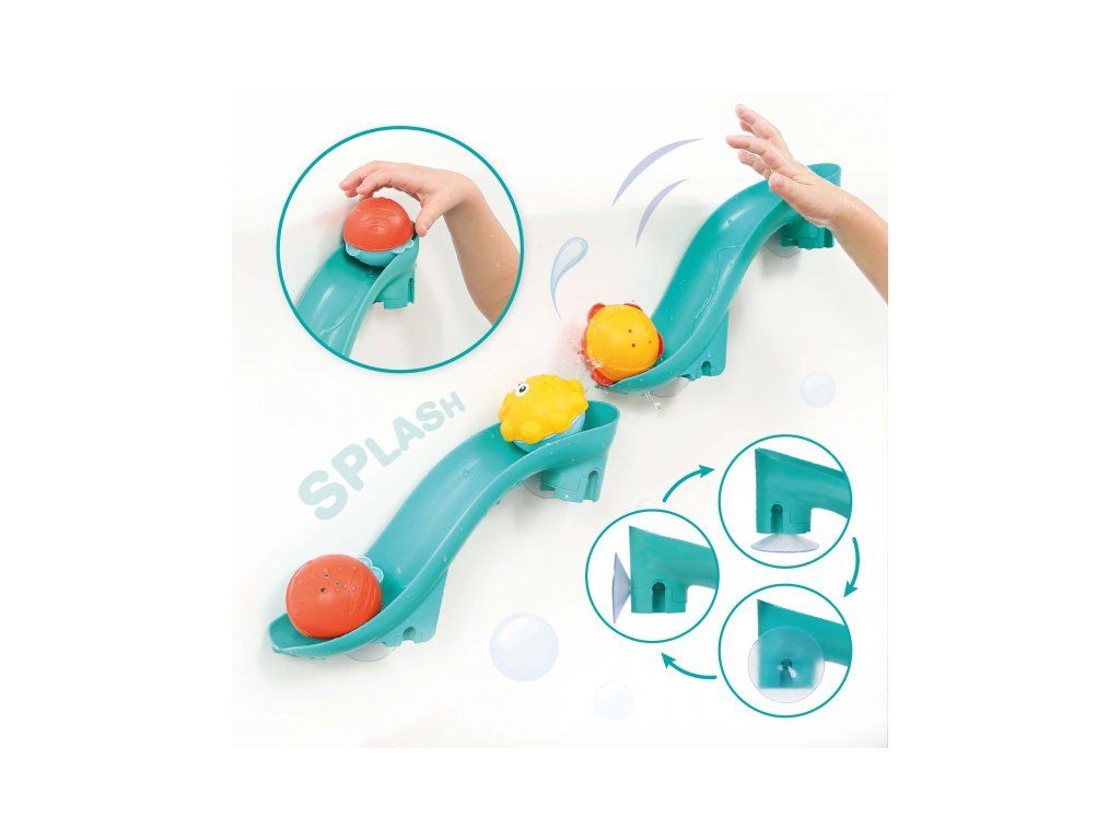 - Vodné šmykľavky a loptičky - dve odnímateľné šmykľavky s prísavkami môžete upevniť na vaňu alebo obklady – vytvoríte tak jedinečnú vodnú dráhu pre tri loptičky