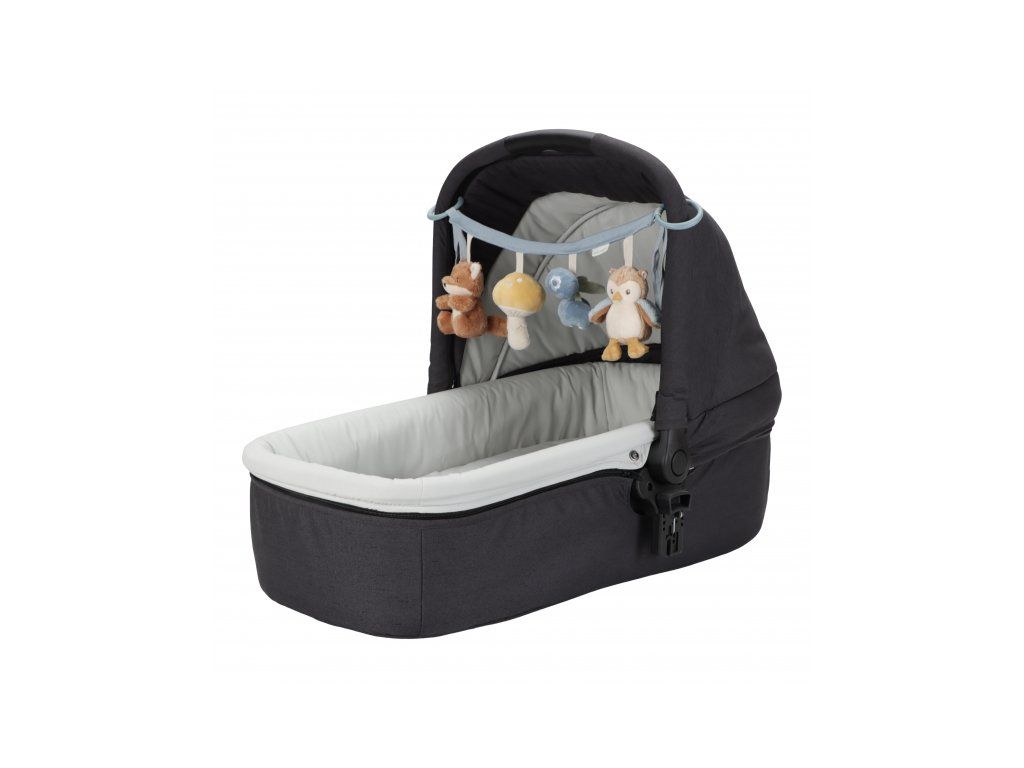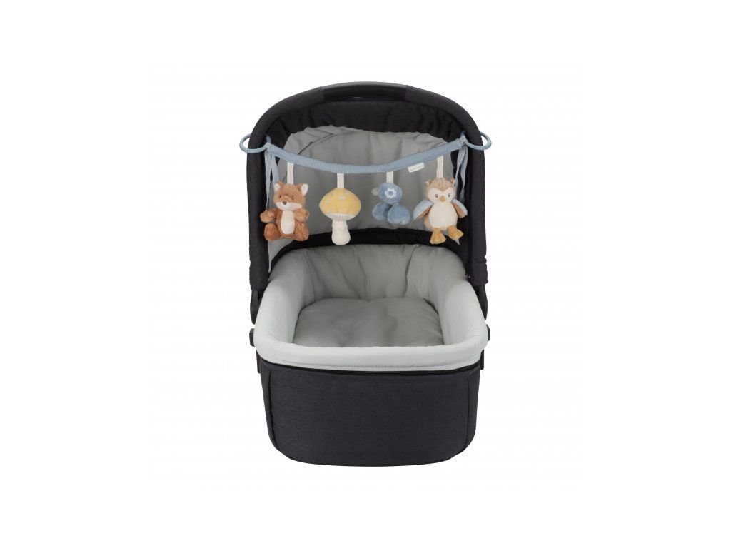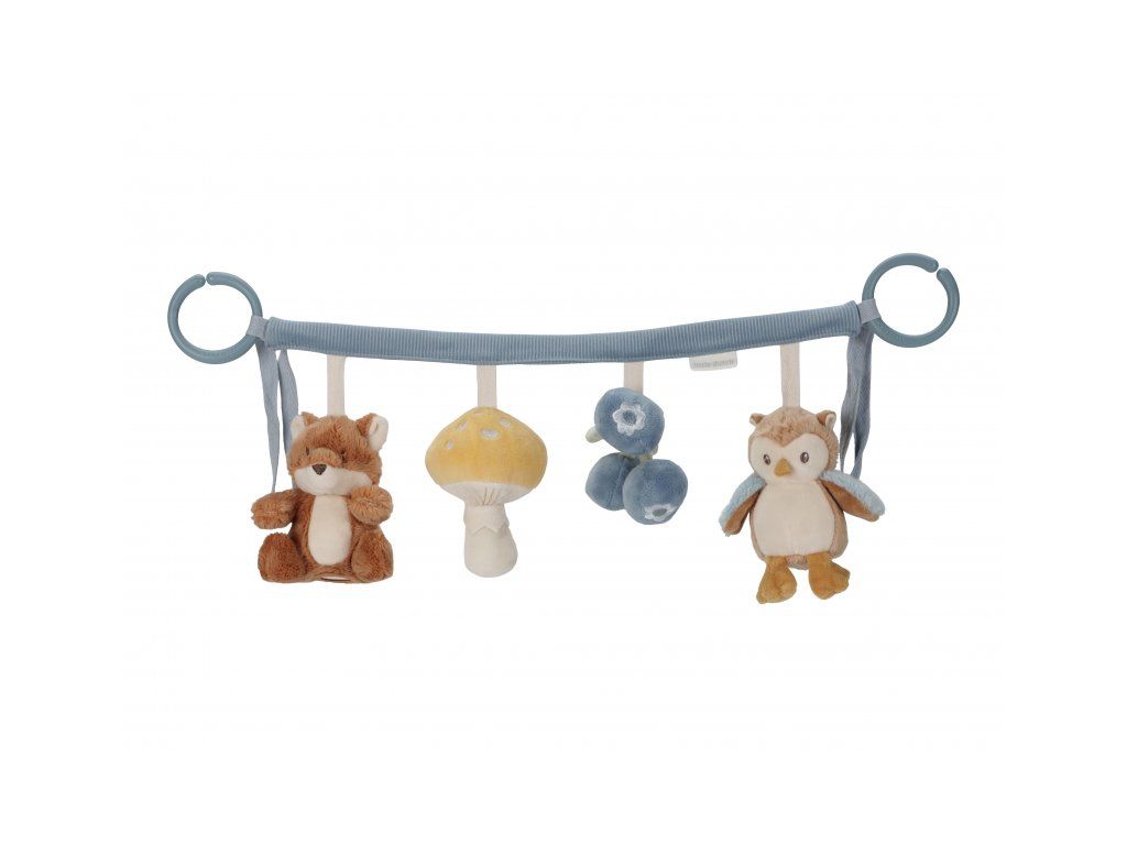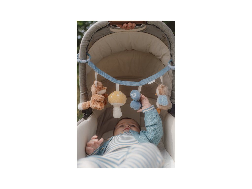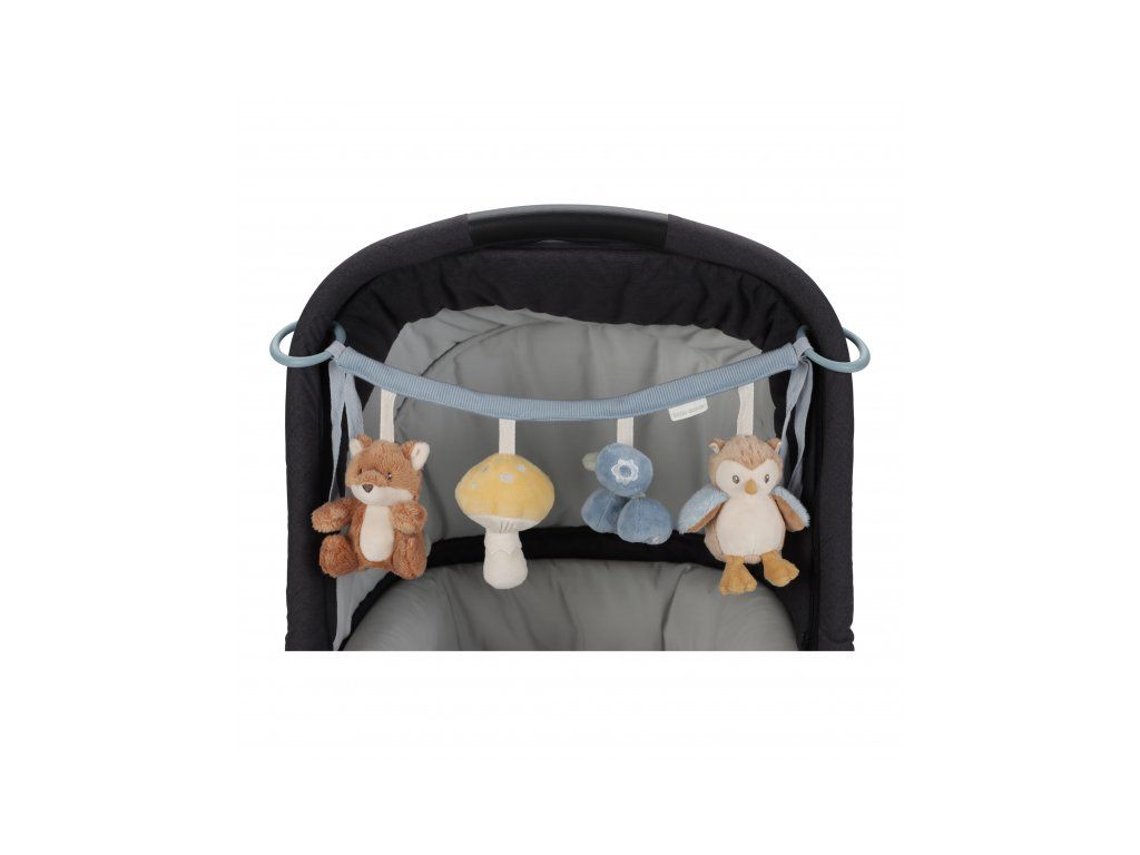 Štyri zavesené plyšové hračky v podobe líšky, sovy, hubky a čučoriedok zabavia vaše bábätko na cestách v autosedačke či kočíku. Jednotlivé hračky pri skúmaní detskými ručičkami hrkajú a šuštia. Hračky stimulujú koordináciu ruka/oko dieťaťa.
