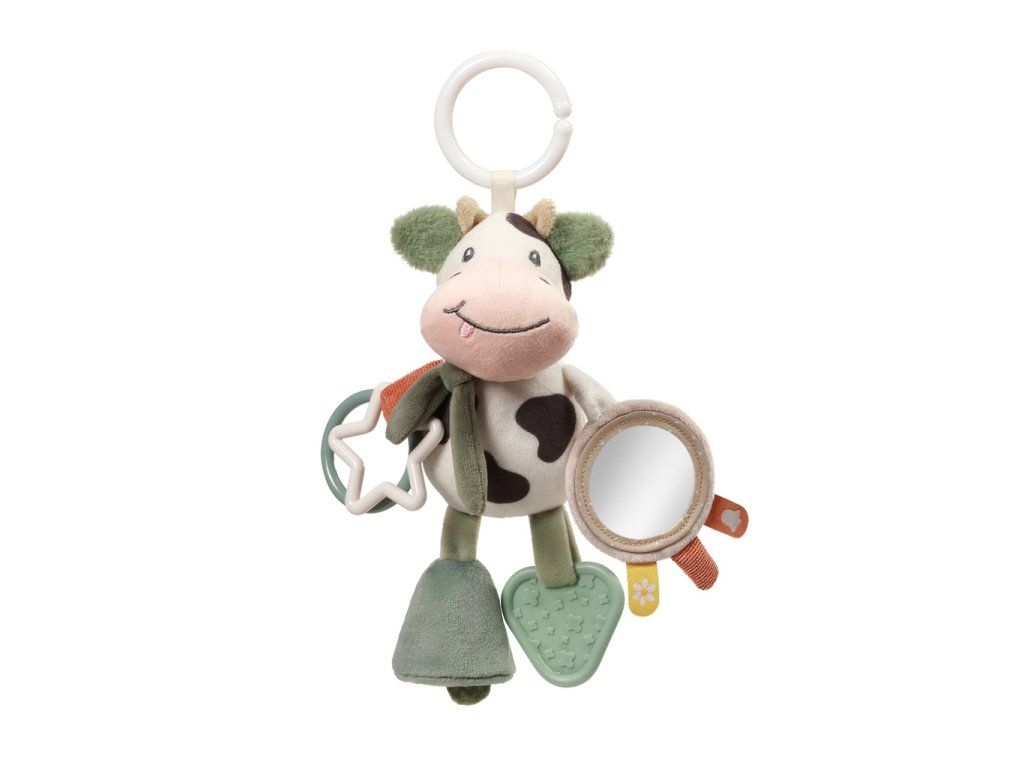 Plyšová kravička do kočíka je skvelou senzorickou hračkou pre bábätká, ktorá stimuluje ich zmysly a rozvíja jemnú motoriku. Univerzálny držiak umožňuje pripevniť prívesok na kočík, vaničku, postieľku alebo autosedačku.Pohodlné materiály a rozmanité farby stimulujú zvedavosť. Zrkadlo upúta oči bábätka a umožní mu preskúmavať vlastnú tvár, hrkálka stimuluje sluch, krúžok a hviezdička povzbudzujú k uchopeniu a flexibilné hryzátko upokojuje boľavé ďasná.