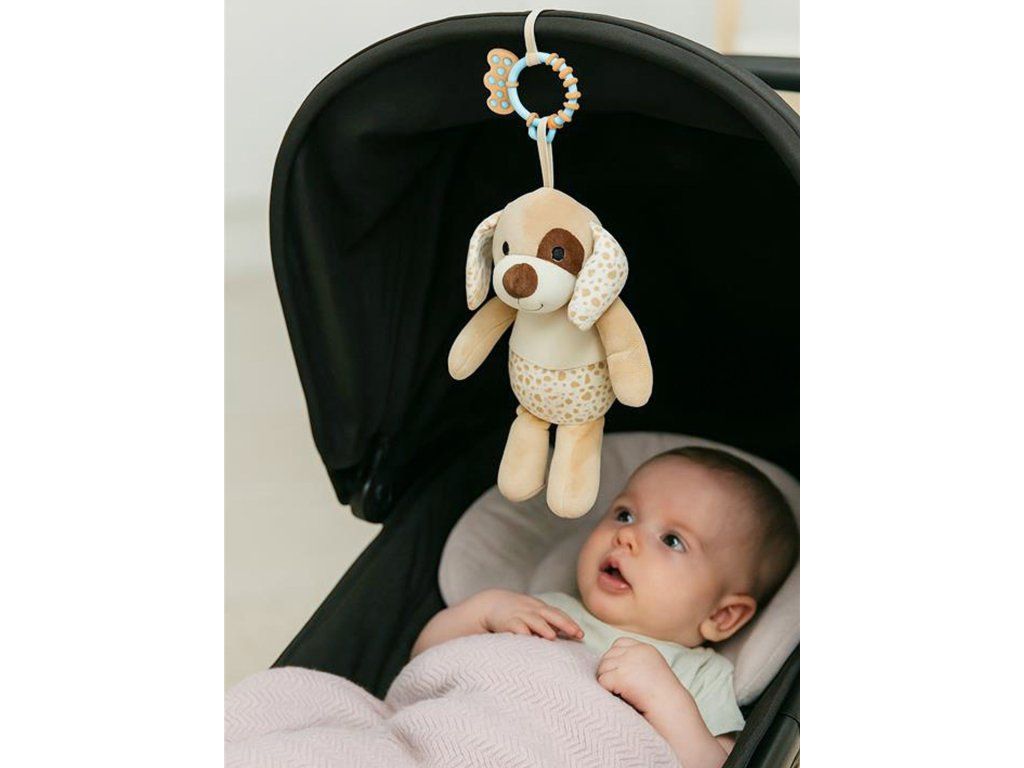 Po zatiahnutí začne jemne vibrovať, čo prebúdza zvedavosť a povzbudzuje k interakcii. Praktický klip umožňuje jednoduché uchytenie na kočík, postieľku alebo autosedačku – ideálne doma aj na cestách.