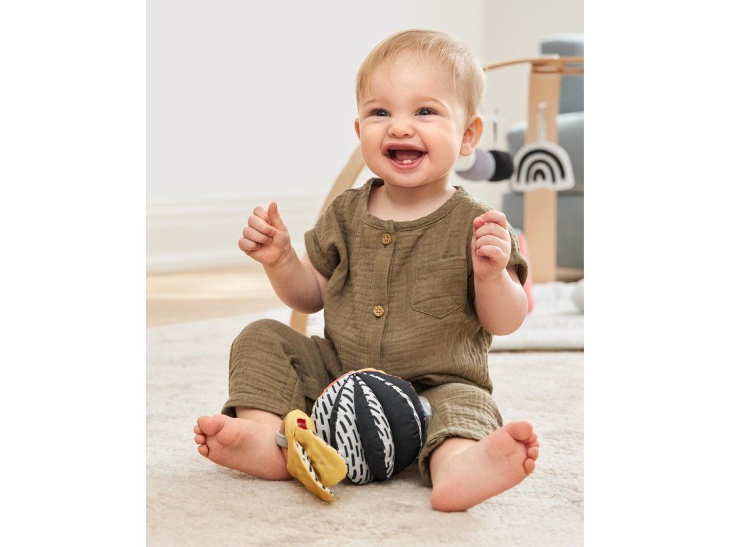- Mäkká hrkajúca loptička s vysoko kontrastným vzorom a farebnými prvkami.