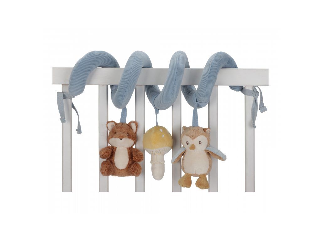 Textilná špirála so zavesenými hračkami v podobe líšky, sovy a hubky zabaví vaše bábätko v postieľke, kočíku aj v autosedačke. Mäkké hračky vyrobené z jemného plyšu hrkajú, šuštia a ponúkajú rôzne textúry na skúmanie. Hračky stimulujú koordináciu ruka/oko dieťaťa.