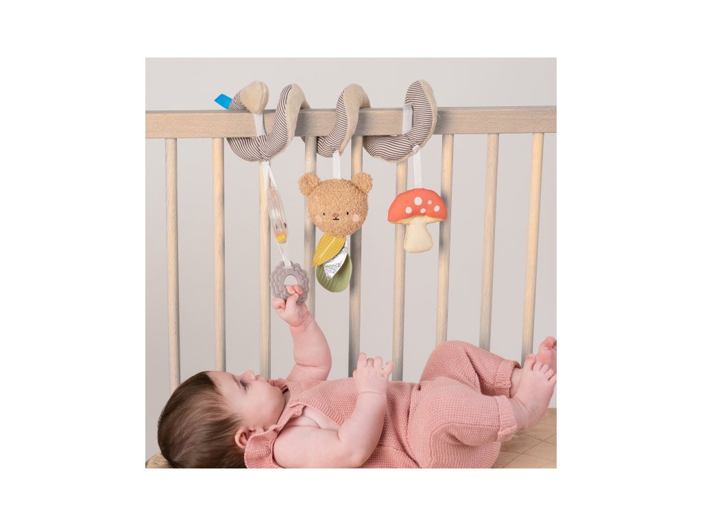 Špirála Taf Toys Bear Hugs je multi-senzorická hračka, ktorá zabaví vaše bábätko od narodenia doma aj na cestách. Vďaka špirálovému tvaru ju ľahko upevníte na kočík, postieľku alebo autosedačku. Pozornosť dieťaťa upúta kombinácia mäkkých plyšových hračiek s hryzátkami a hrkálkami. Zavesené hračky z rôznych materiálov podporujú pokojné skúmanie rukami aj očami a pomáhajú rozvíjať prvé zručnosti počas každej prechádzky aj odpočinku doma.