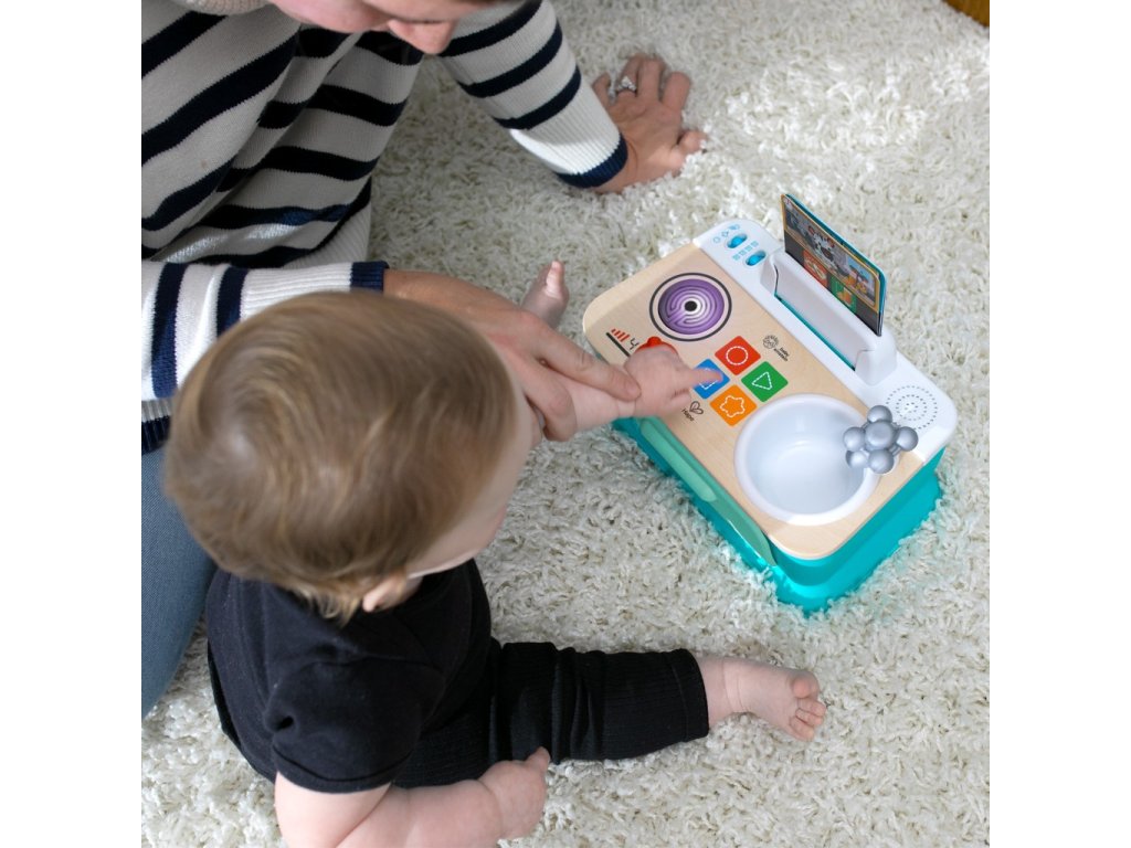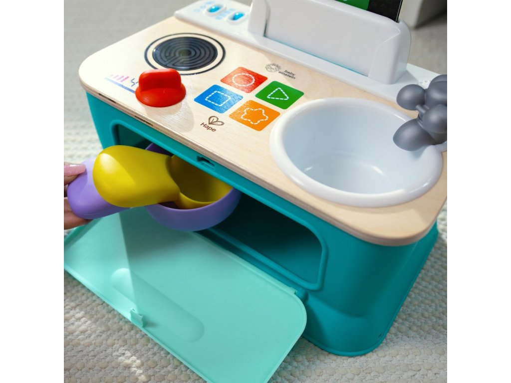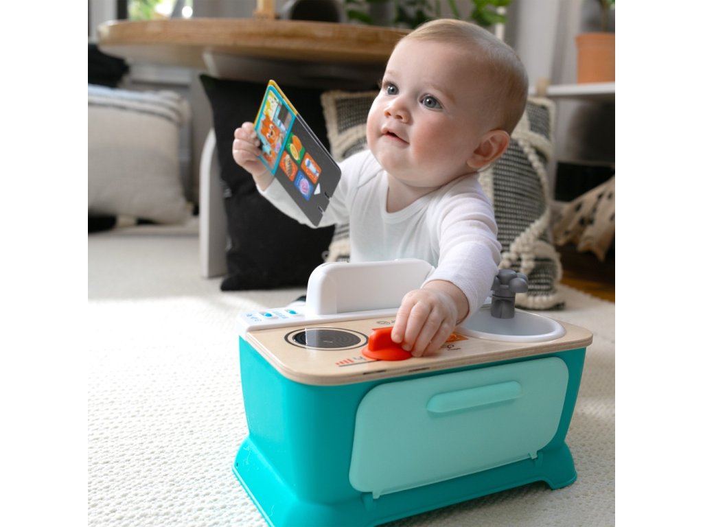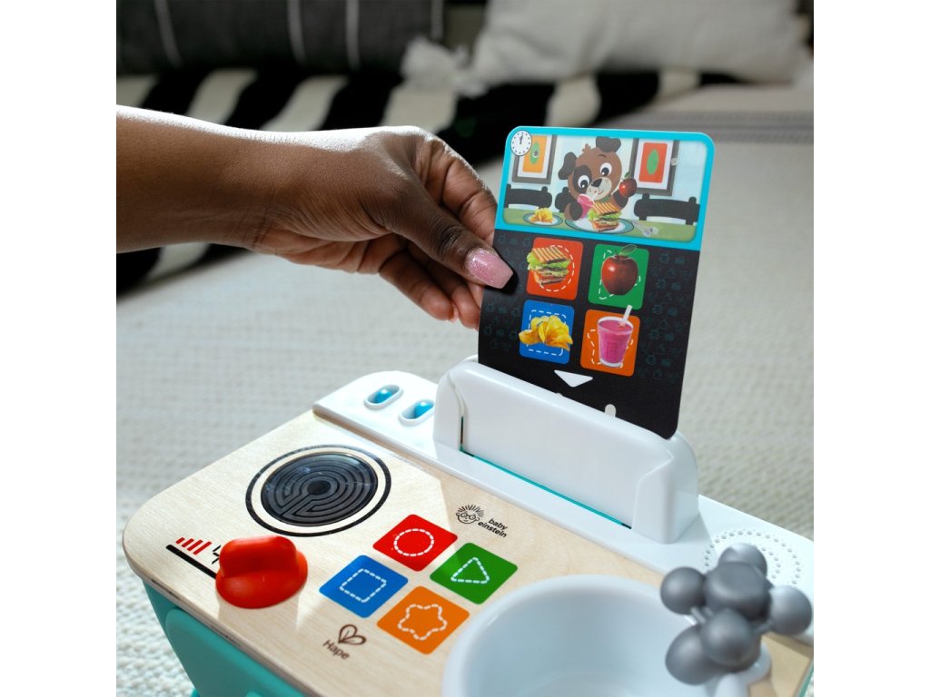 Pomôžte dieťaťu spoznať súčasti okolitého sveta, ako sú jedlá, farby a tvary, s kuchynkou Baby Einstein + Hape Magic Touch. Táto farebná kuchynka na hranie z dreva s certifikátom FSC je vybavená rúrou, drezom a varnou doskou, ktoré pomáhajú bábätku napodobňovať varenie! V režime Play môžu deti skúmať zvuky a melódie varenia. V režime Discovery - Objavuj sa môžu batoľatá učiť jedlá, farby a tvary v angličtine, španielčine, francúzštine a nemčine. 3 kartičky receptov pomáhajú bábätku „uvariť“ až 6 receptov na raňajky, obedy alebo večere pomocou priloženého hrnca a lyžice. Stlačte vybraný dotykový symbol na ultra citlivej varnej doske Magic Touch, aby ste uvarili každý recept za zvukov hudby a varenia. Bábätko bude zvedavé, keď bude otáčať gombíkmi sporáka a kohútika, čím aktivuje svetlá a zvuky. Táto malá prenosná kuchynka, ktorá je ideálna na hranie na zemi, pomáha podporovať rozvoj jemnej motoriky dieťaťa a inšpiruje k spoločnej hre s rodinou a priateľmi. Pre deti od 9 mesiacov do 4 rokov. Obsahuje 3 AA batérie.Vlastnosti: