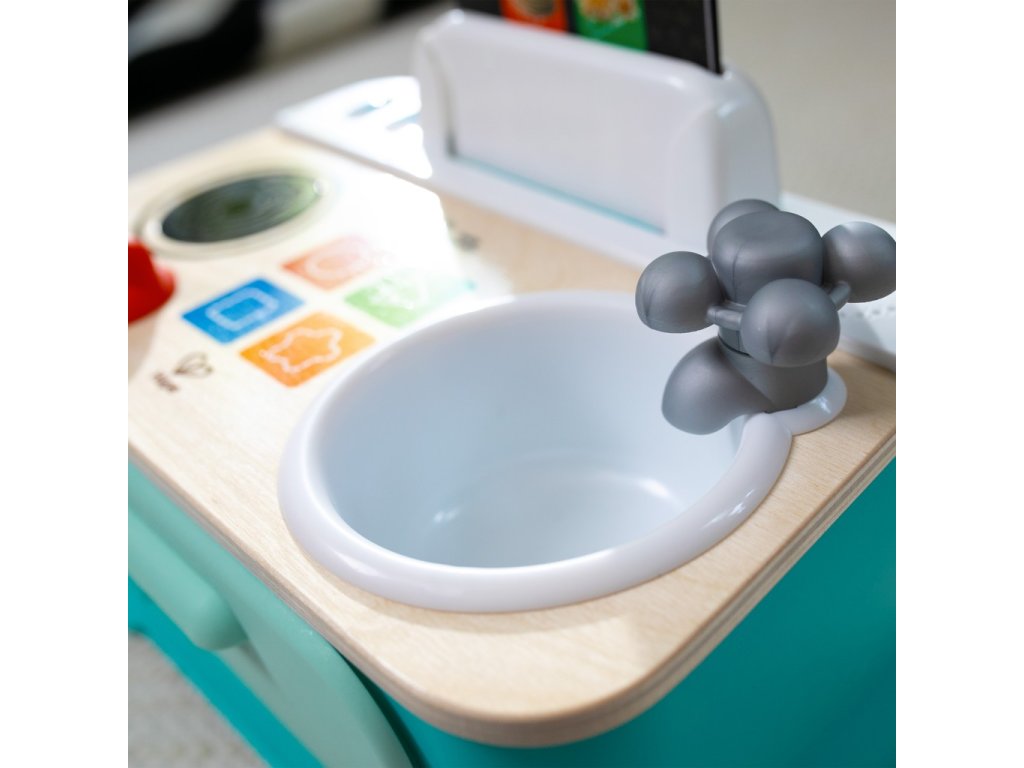 - Režim prehrávania povzbudzuje deti, aby skúmali čo sa stane, keď otočia gombíkmi kohútika a sporáka, dotknú sa 4 tlačidiel Magic Touch a otvoria sporák, aby sa aktivovali svetlá, zvuky kuchyne a hudba.