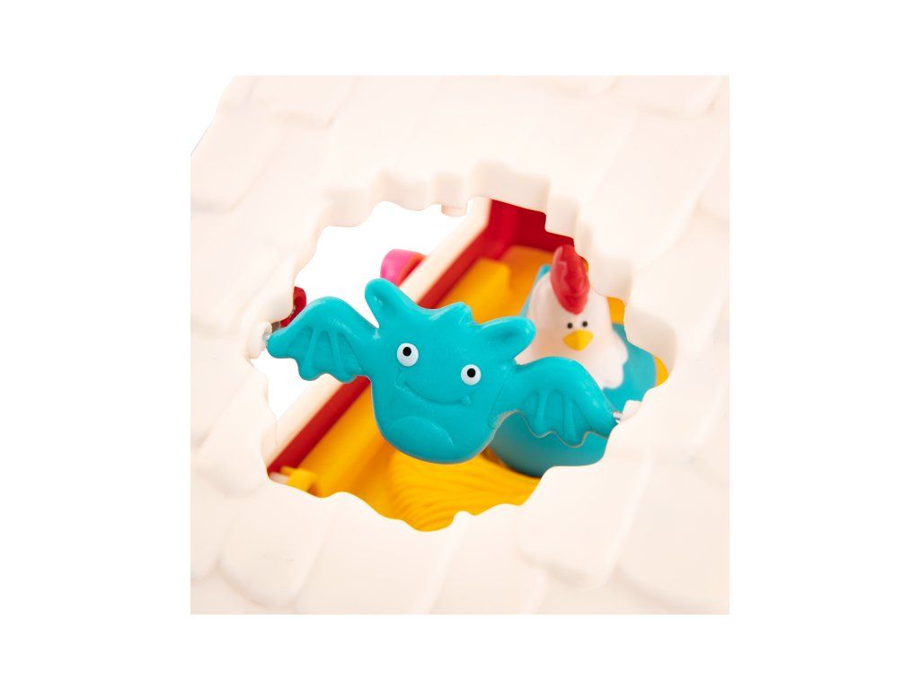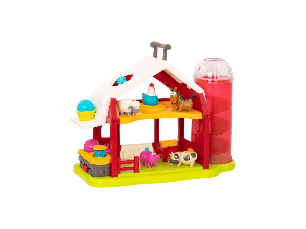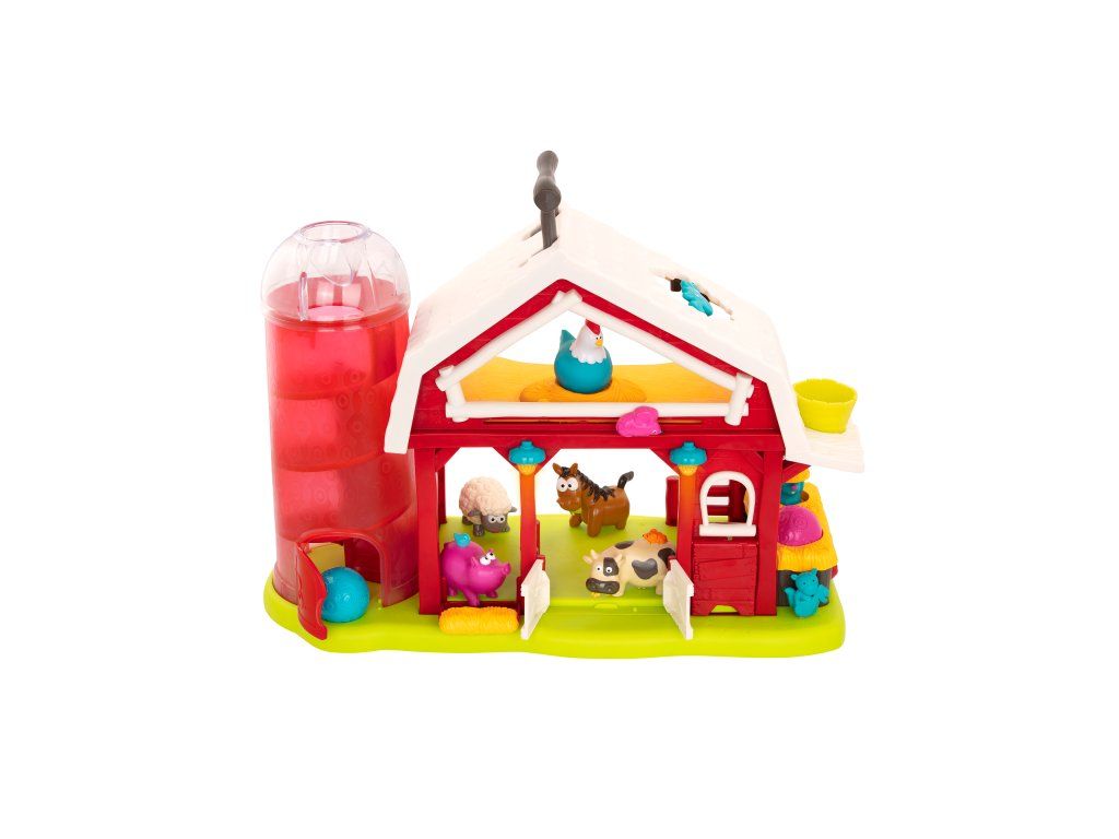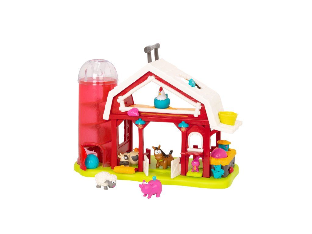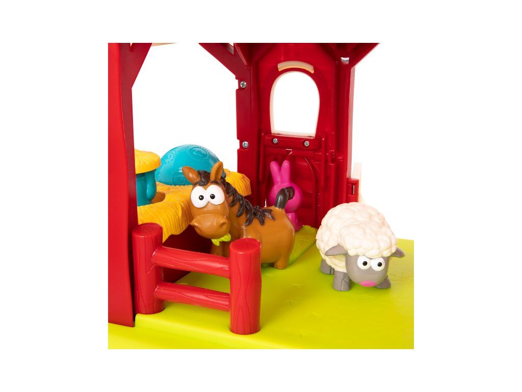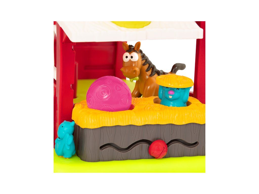 Interaktívna farma so zvieratkami je tu, aby vášmu dieťaťu priniesla hodiny a hodiny nápaditej hry! Farma ponúka množstvo rôznych prekvapivých aktivít, ktoré budú deti postupne objavovať. Otvorte dvierka stodoly, rozsvietia sa svetielka! Postavením kravičky, prasiatka, ovečky alebo koníka dovnútra stodoly pustíte jednu zo štyroch melódií so zvukmi jednotlivých obyvateľov farmy. Vložte do otvoru v streche sila vedľa stodoly guličku a sledujte, ako beží dráhou dole, až vyskočí spodnými dvierkami. Posúvajte myšku nad dverami stodoly a sliepočka na pôde začne skákať a kvokať. Stlačením veveričky aktivujete hudobný mišmaš. Otvorte dvierka a objaví sa zajačik. Vložte guľôčku do kôpky sena a jukne na vás krtko. Netopier na streche sa otáča.