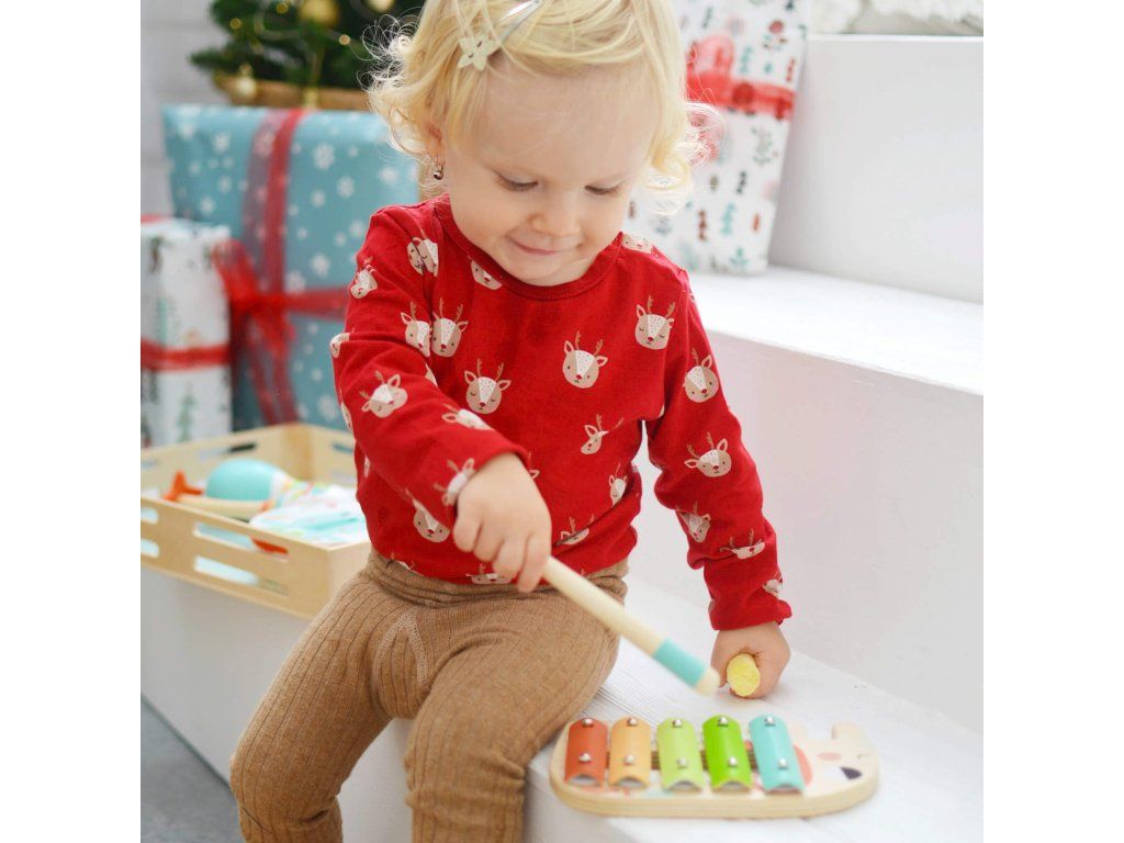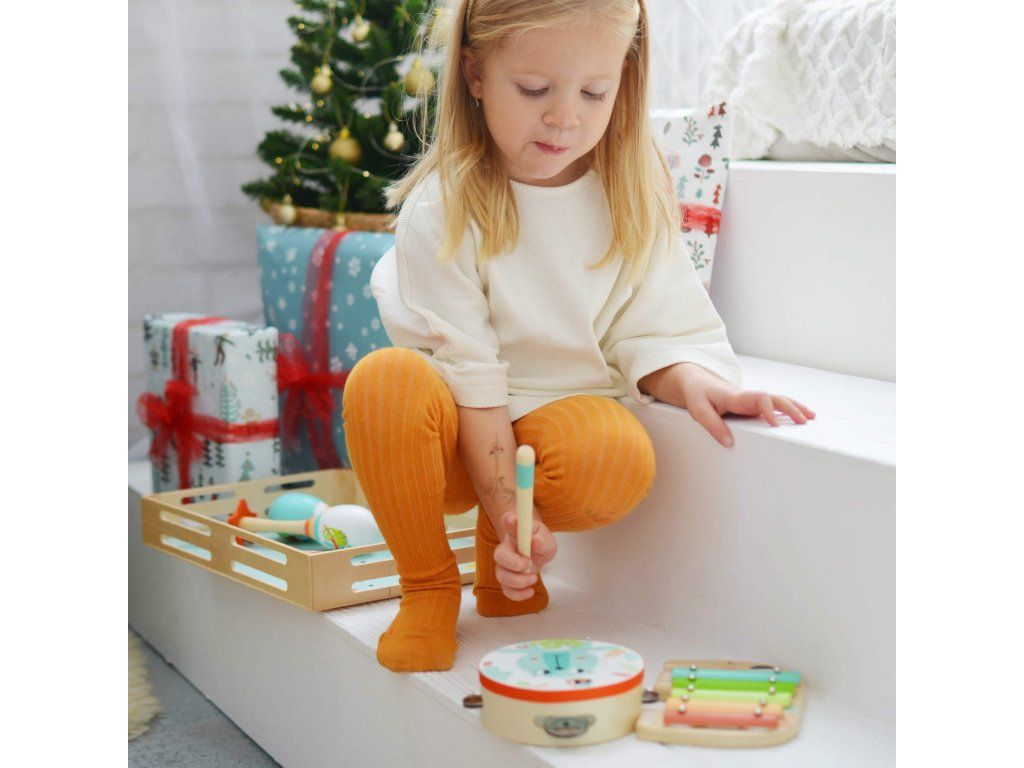 Hudobná sada Zvieratká Deti sa hudbu naučia milovať. Hudobná sada Zvieratká pozostáva zo štyroch hudobných nástrojov a rytmických hračiek uložených v drevenom boxe. Jednotlivé hudobné nástroje sú vyhotovené s motívmi rozkošných zvieratiek a v krásnych farebných tónoch, ktoré spolu ladia. Sada obsahuje xylofón, rumba gule, flautu a tamburínu.Rozvíjajú si koordináciu a zmyslové vnímanie. Hudobné nástroje upevňujú vzťah detí k hudbe a cvičia rytmické zručnosti dieťaťa. Rozvíjajú schopnosť koordinovať svoje pohyby a zlepšuje ich koncentráciu. Podporujú detskú tvorivosť experimentovaním s rôznymi variáciami zvukov.Dodatočné parametre