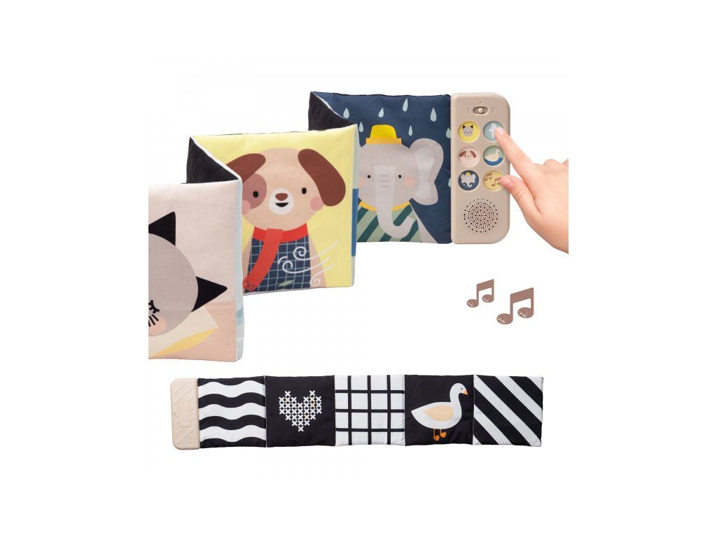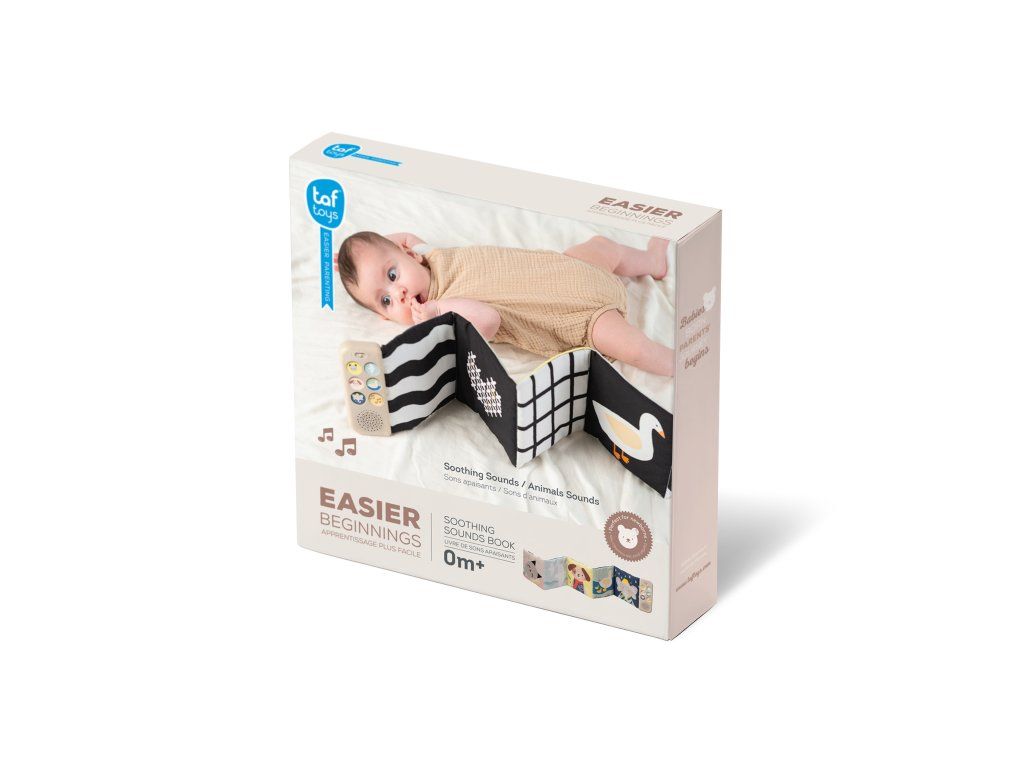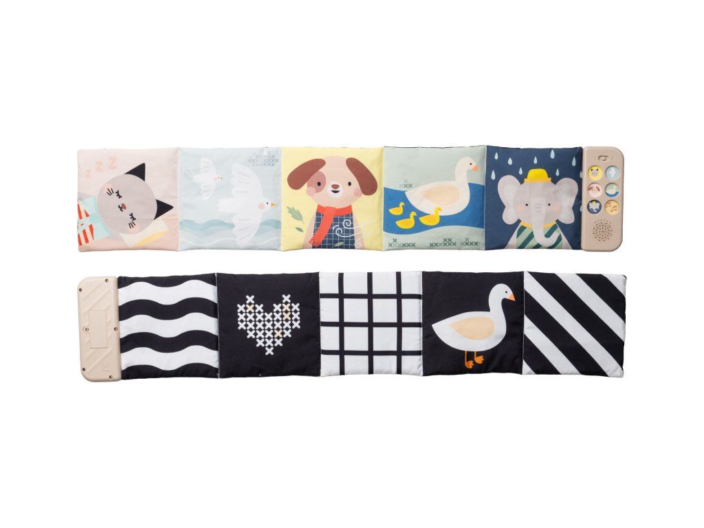 Obojstranná textilná knižka Taf Toys pomôže zabaviť a upokojiť bábätko už od narodenia. Knižka samostatne stojí a je tak ideálna na hranie na brušku. Vďaka klipom ju ľahko umiestnite aj do kočíka na zabavenie dieťaťa na cestách.