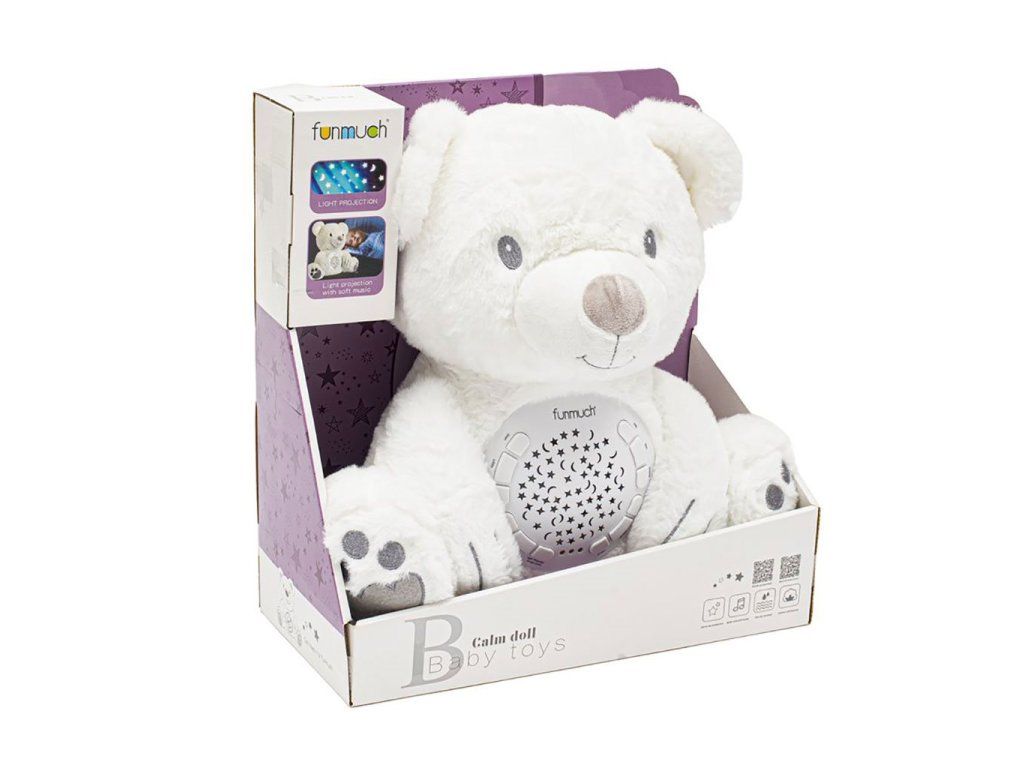 Plyšáčik s projektorom je úžasným pomocníkom pri uspávaní detí. Jeho design je mäkký a pohodlný, ideálny pre malé deti. Zaspávač je vyrobený z mäkkého a príjemného plyšového materiálu. Plyšáčik je vybavený projekčným zariadením, ktoré na stenu alebo strop premieta krásne farebné hviezdičky a mesiac. Zaspávačik má tiež funkciu bieleho šumu, ktorá produkuje pokojný šum, podobný šumu vĺn, dažďa alebo tichého vetra a vytvára relaxačný zvukový podklad pre uspávanie dieťaťa. Okrem bieleho šumu môže zaspávač prehrávať pokojnú a jemnú hudba, ktorá môže byť voliteľne zapnutá alebo vypnutá podľa preferencie. Batérie sa do medvedíka vkladajú tak, že sa odstráni bruško.