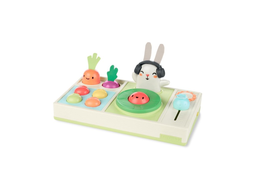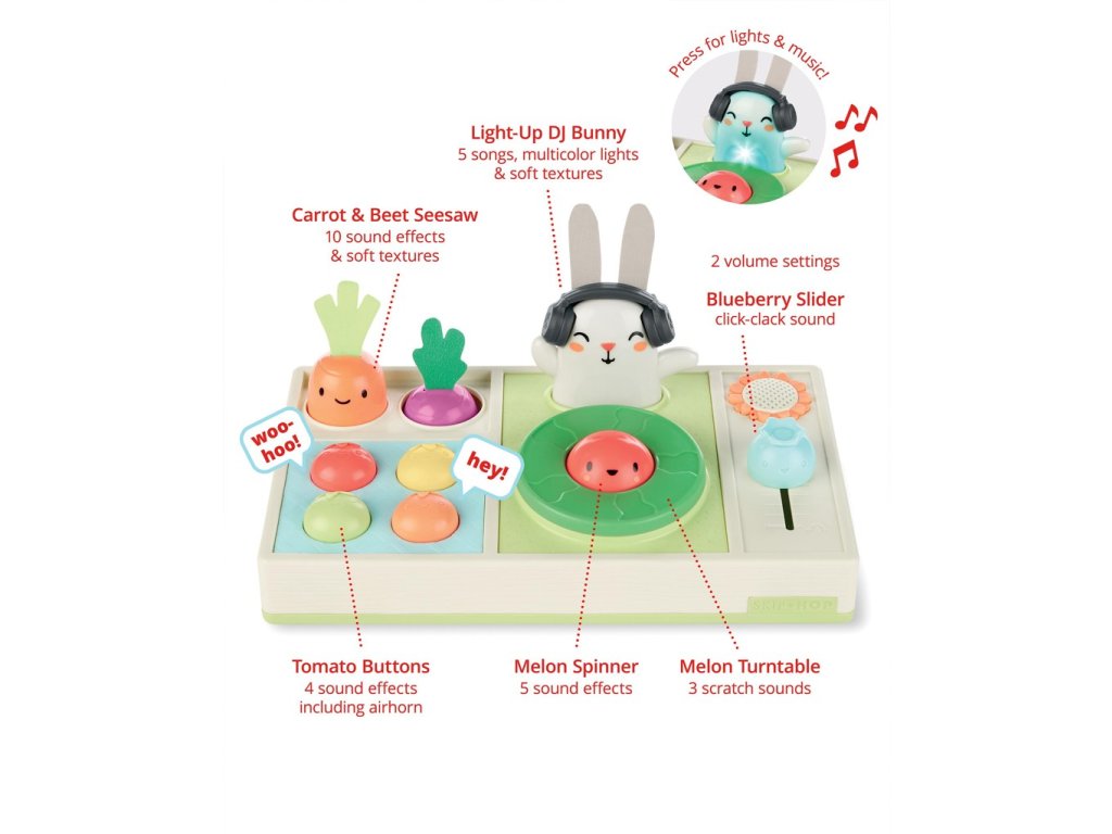 Majstri mini mixov si radi zahrajú čerstvú „cviklu“ s naším DJ setom s tematikou ovocia a zeleniny. Naša hudobná hračka pre bábätko, ktorá je nabitá viac ako 30 hracími funkciami vrátane skvelého svietiaceho DJ zajačika, piesní, zvukov a ďalších, rozbehne párty a zároveň povzbudí jemné motorické zručnosti, koordináciu ruka-oko a ďalšie aktivity na budovanie zručností.Vlastnosti: