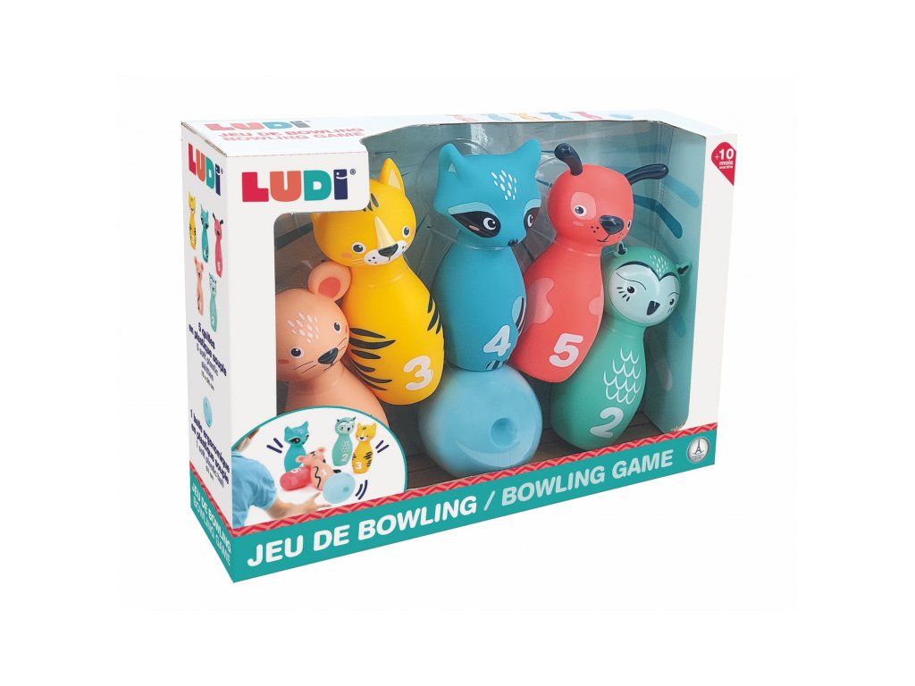 Sada obsahuje päť kolkov v tvare zvieratiek s číslami a guľou s otvormi na uchopenie ako pre skutočných hráčov bowlingu.