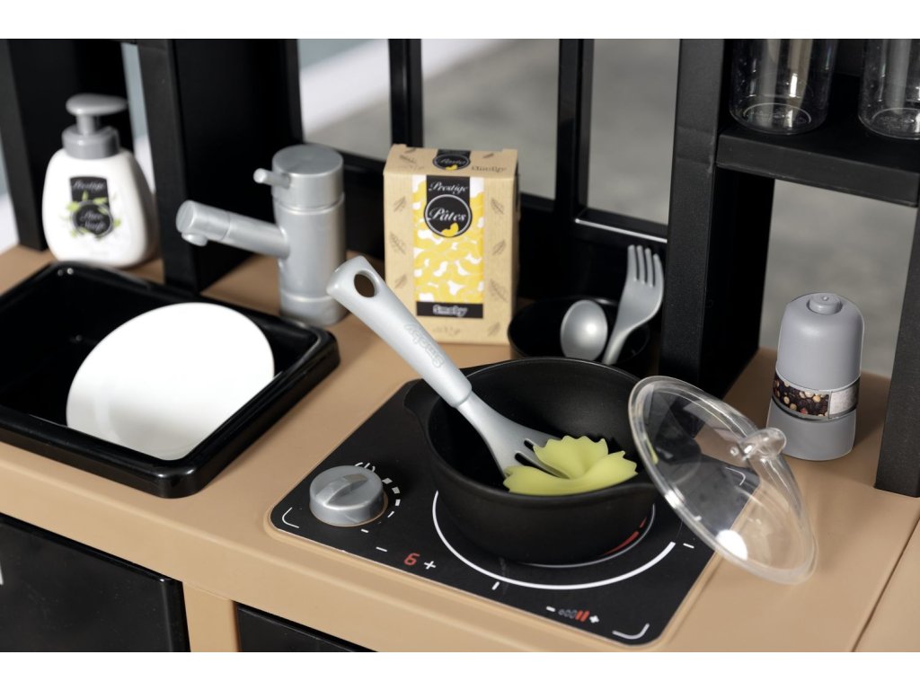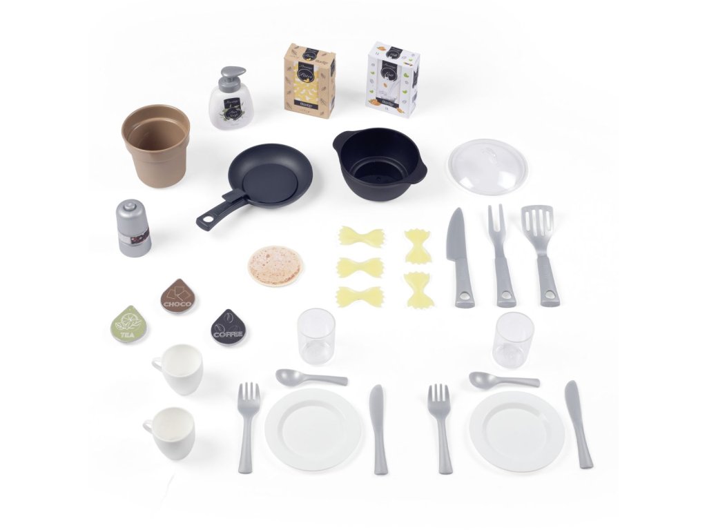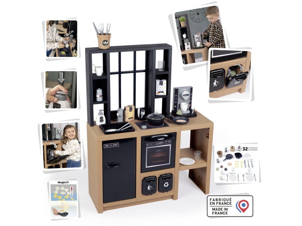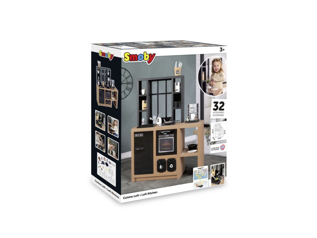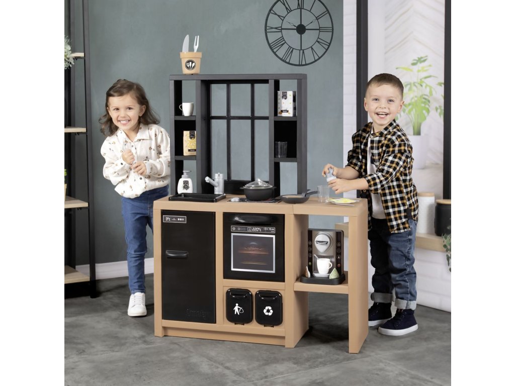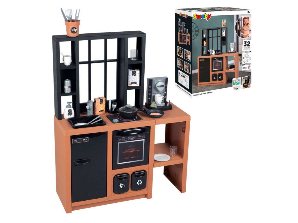 Veľká kuchynka v industriálnom vzhľade vybavená sporákom, rúrou, chladničkou, kávovarom, drezom a nádobami na separáciu odpadu. Obsahuje 32 kusov príslušenstva. Rozmery kuchynky: 74 x 95,7 x 29,2 cm. Výška pracovnej dosky 50 cm.Dodatočné parametre