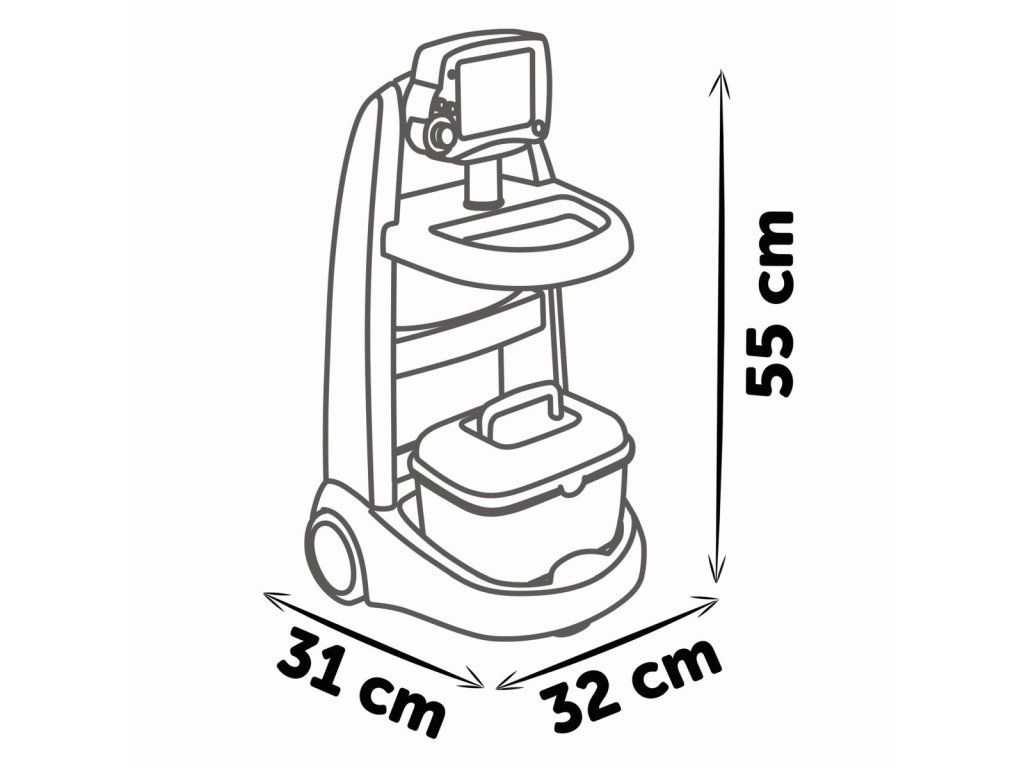 Elektronický lekársky vozík s 2 kolieskami. Mobilný núdzový vozík je ľahký a ovládateľný aj pre menšie deti. Elektronický modul EKG má početné funkcie a zvukové efekty, vďaka ktorým je hra na doktora realistickejšia. V úložných priestoroch je všetko, čo je potrebné pre naliehavé prípady na ošetrenie pacientov: infúziu, lekársky kufrík s nespočetným množstvom pomôcok, ako je injekčná striekačka, teplomer, nožnice, poháre, stetoskop, makety obalov od liekov a mnoho ďalšieho. Rozmery produktu (D׊×V): 31 × 32,1 × 55,2 cm.Dodatočné parametre