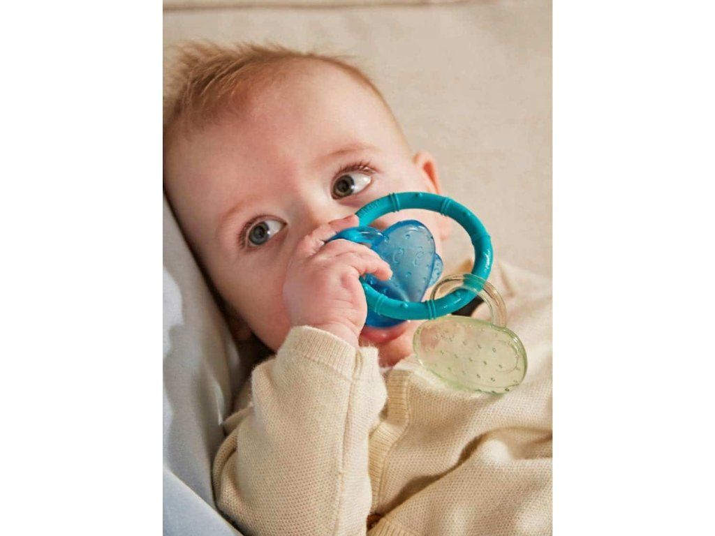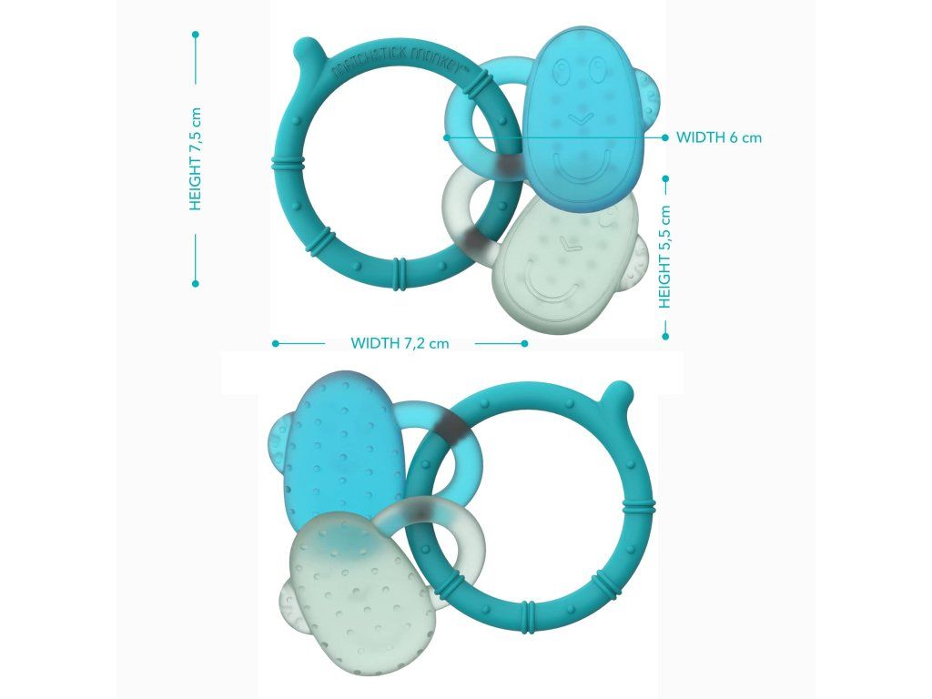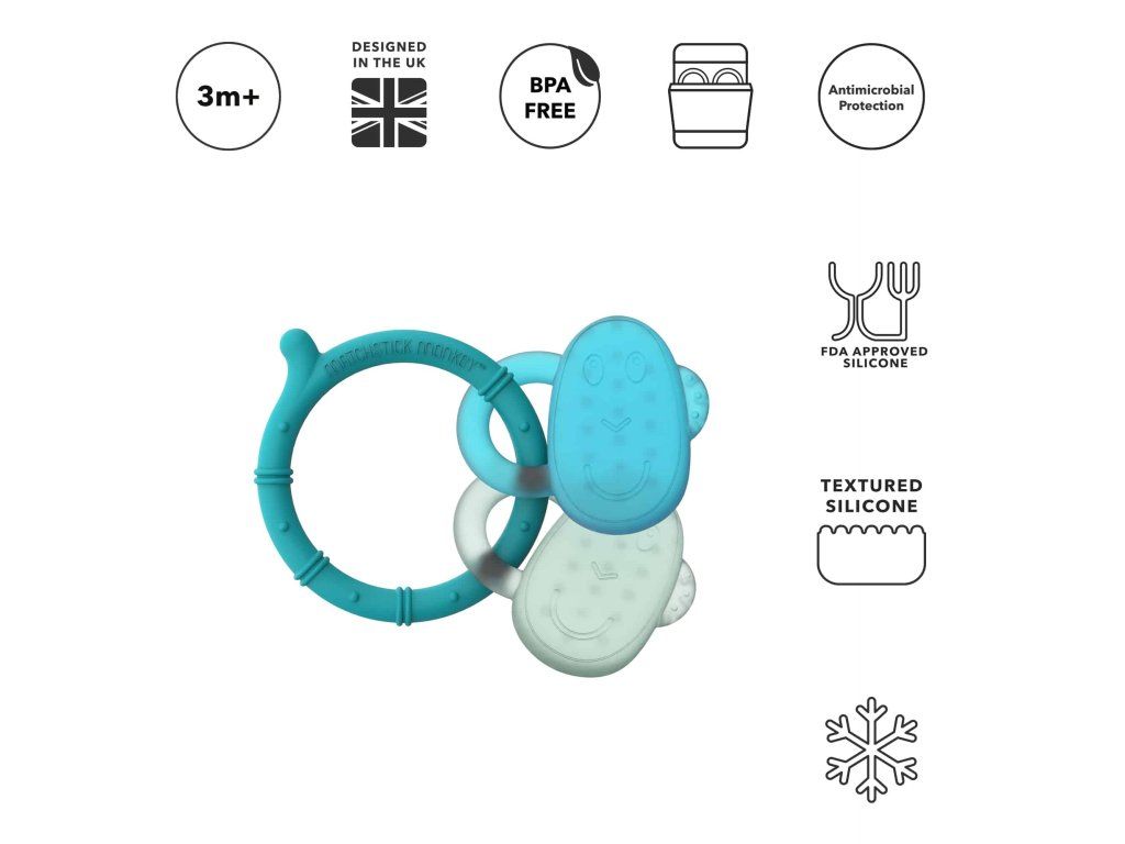 Vodou plnené hryzátko v tvare usmievavej opičky prináša okamžitú úľavu pri prerezávaní zúbkov. Stačí ho vložiť do chladničky a jeho chladivý efekt pomôže upokojiť podráždené ďasná. Jemné masážne výstupky príjemne stimulujú ďasná, zatiaľ čo ergonomický tvar umožňuje dieťatku ľahké držanie. Hryzátko obsahuje antimikrobiálnu ochranu BioCote®, vďaka ktorej zostáva dlhšie svieže a hygienicky čisté. Je bez BPA, schválené FDA a vhodné pre deti od 3 mesiacov.Dodatočné parametre