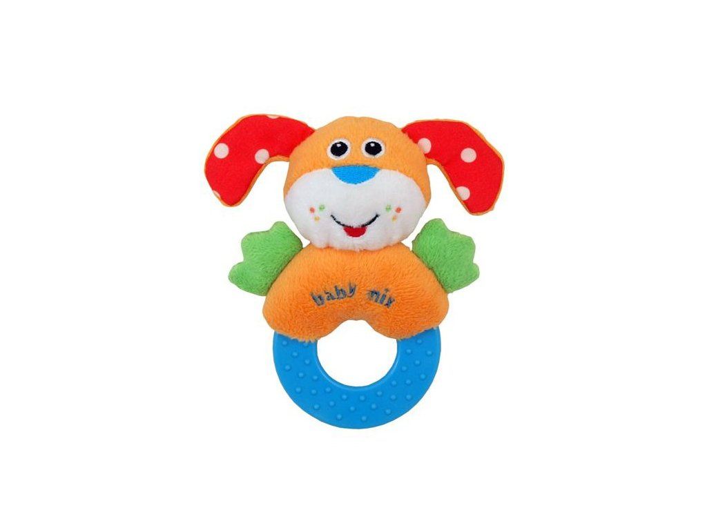 Farebná plyšová hrkálka Baby Mix pre bábätká v tvare psíka. Psík hrká a má hryzátko. Hračka je vyrobená z kvalitného a príjemného materiálu. Výška cca 12 cm. Vhodné pre deti od prvých dní života.Dodatočné parametre