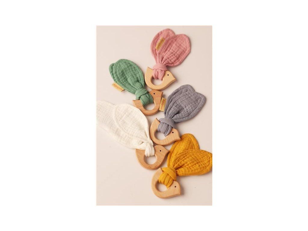 Hryzátko s mušelínovou plienkou je ideálna súprava, keď sa dieťaťu prerezávajú zúbky. Hryzátko je vyrobené z bukového dreva šetrného k životnému prostrediu a mäkkej mušelínovej tkaniny. Je úplne bezpečná pre bábätká a prináša upokojujúcu úľavu pri prerezávaní zúbkov. Hryzátko možno použiť aj ako hračku pre bábätká. Hryzátko sa dokonale hodí k našim ostatným mušelínovým výrobkom a vytvára krásnu súpravu, ktorú môžete darovať ako darček na oslavu narodenia dieťaťa.