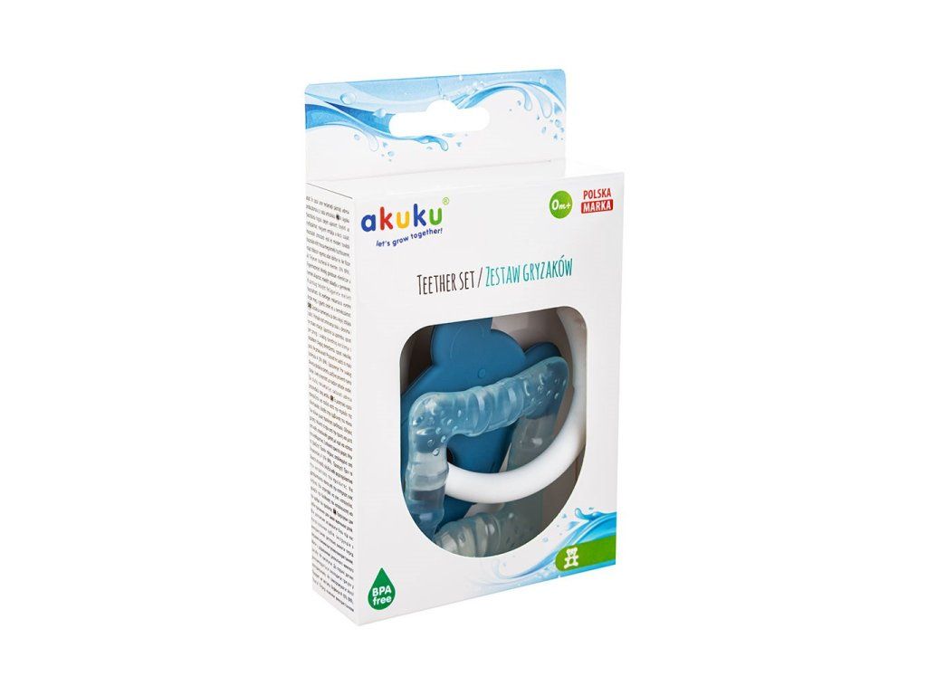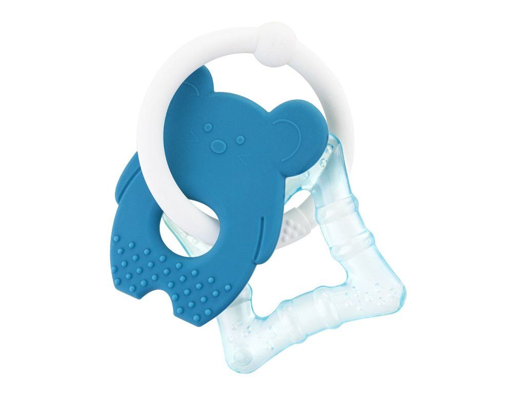 Sada dvoch hryzátok. Jedno je vyrobené zo silikónu, druhé je naplnené destilovanou vodou. Sada teda obsahuje ako mäkšie (chladiace), tak tvrdšie hryzátko - je tak ideálnym a kompletným riešením pre všetky fázy prerezávania zúbkov. Špeciálne tvarovaný povrch zaisťuje jemnú masáž ďasien. Ľahko sa drží v malých detských ručičkách. Po predchádzajúcom schladení v chladničke pomáha dieťaťu tíšiť bolesť podráždených ďasien. Moderný dizajn a farby priťahujú pozornosť dieťaťa, rozvíjajú jeho zrakové a motorické schopnosti. Nemá žiadne ostré hrany. Je vyrobené z vysoko kvalitných, bezpečných a odolných materiálov, ktoré je možné ľahko umývať.