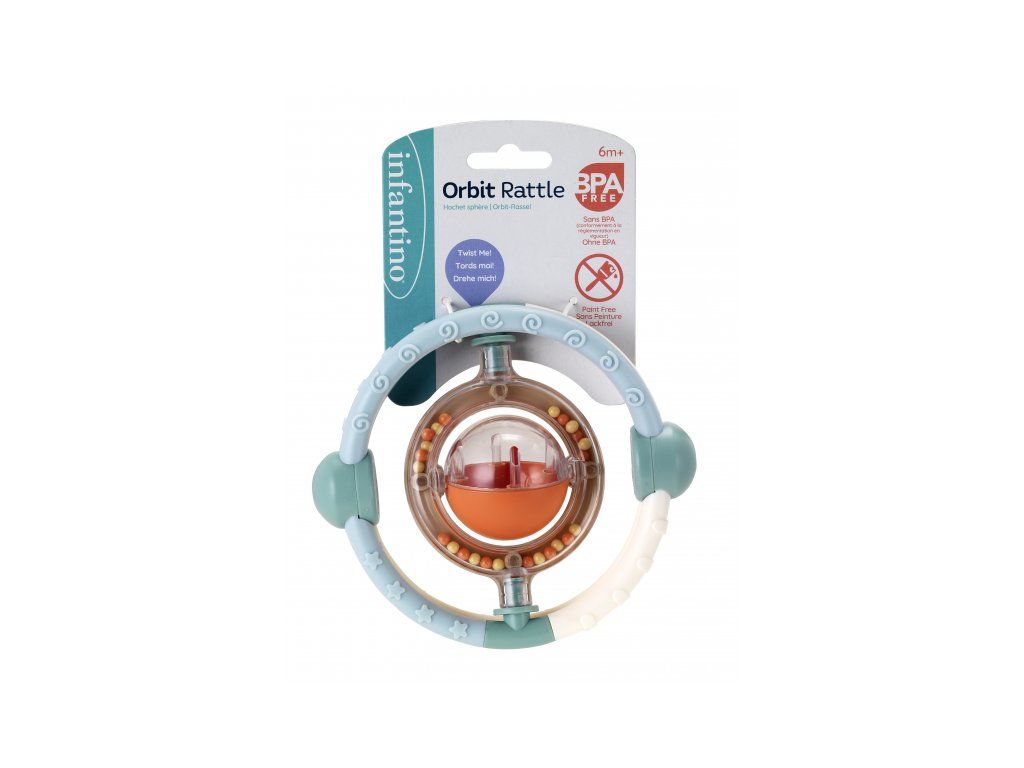 Hrkálka Infantino s rôznymi textúrami má tvar pre ľahké uchopenie a skúmanie ručičkami aj v ústach. Korálky vo vnútri priehľadného krúžku pri pohybe jemne hrkajú.