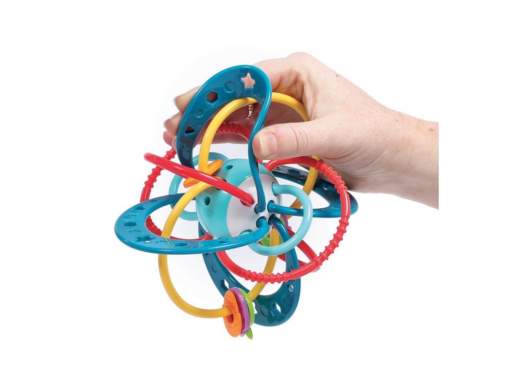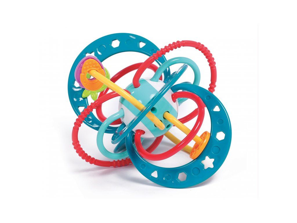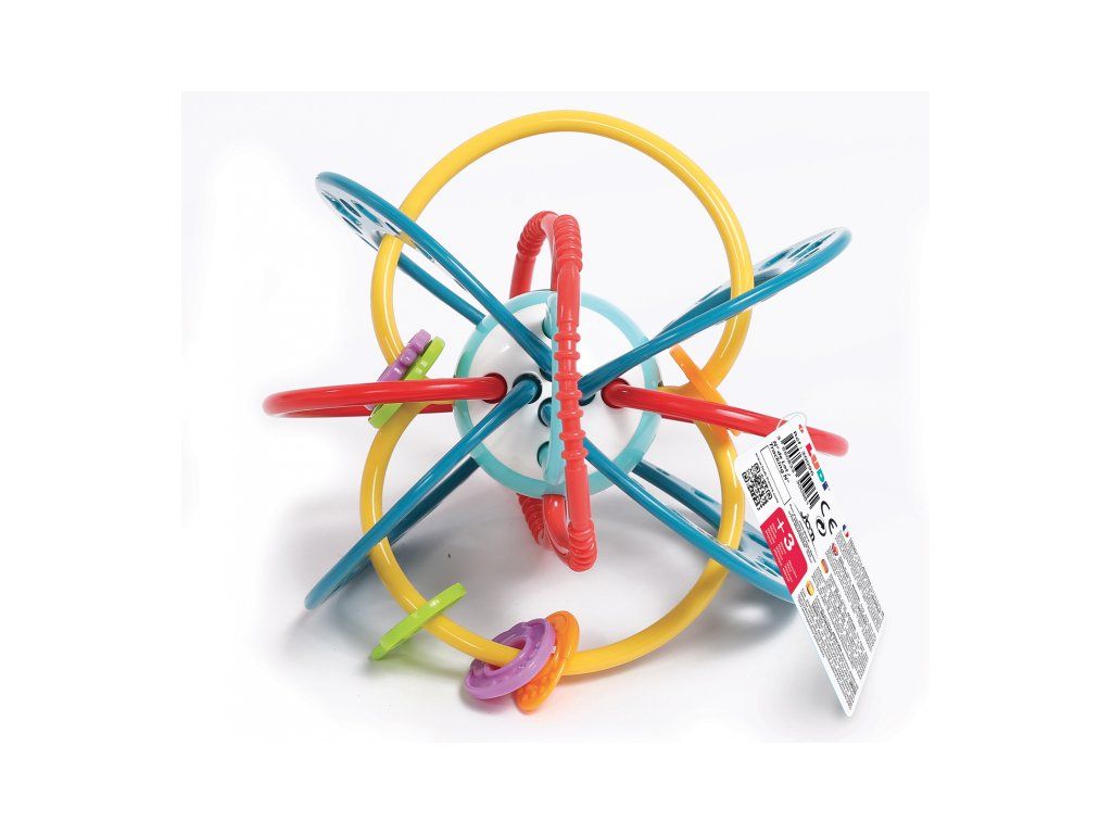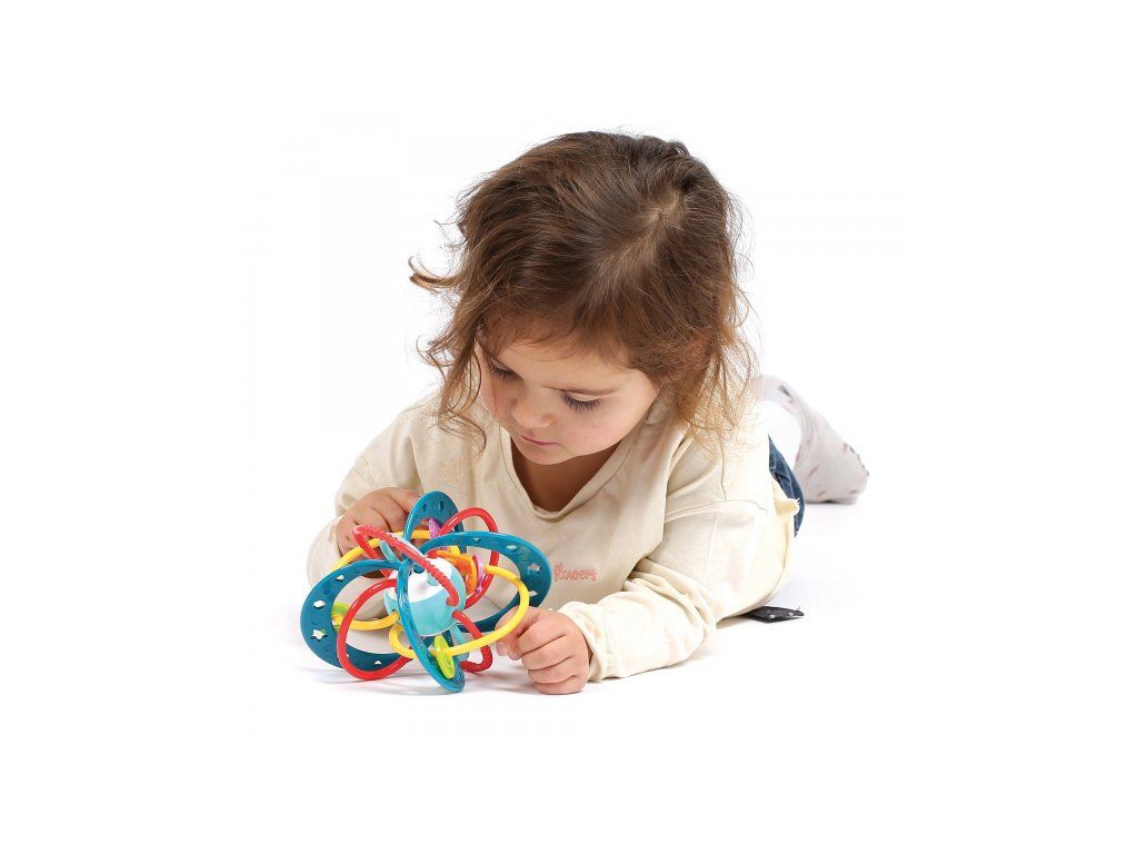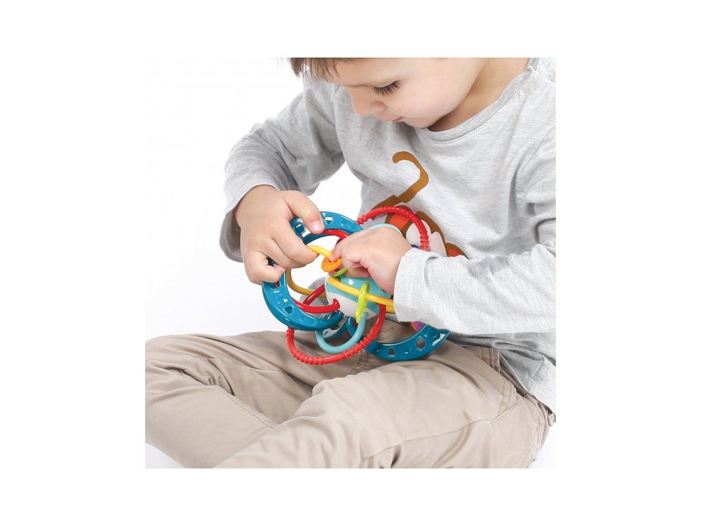 Unikátna hrkálka z pružného materiálu ponúka mnoho možností na uchopenie a skúmanie. Pozornosť dieťaťa upútajú výrazné farby, rôznorodé textúry aj pohyblivé korálky. Najmenšie deti hrkálku budú skúmať rukami aj ústami, hrkálka môže slúžiť aj ako hryzátko na masírovanie ďasien pri prerezávaní prvých zúbkov. Staršie deti si môžu cvičiť svoj postreh hádzaním a chytaním hračky namiesto loptičky.