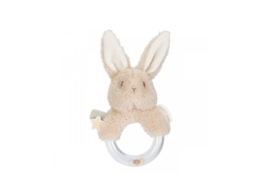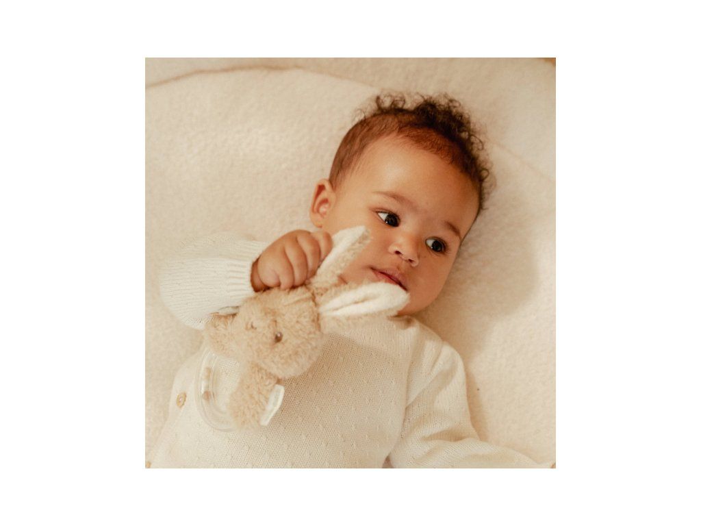 Originálna hrkálka v podobe priehľadného krúžku s hrkajúcimi korálkami a plyšovým králičkom je ideálna ako prvá hračka pre vaše bábätko. Hrkálka má tvar pre ľahké uchopenie a rôznorodé textúry na skúmanie rukami aj ústami.