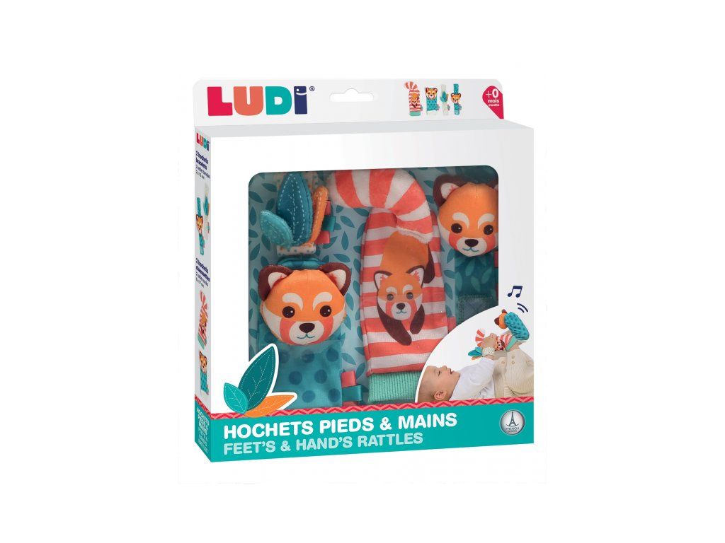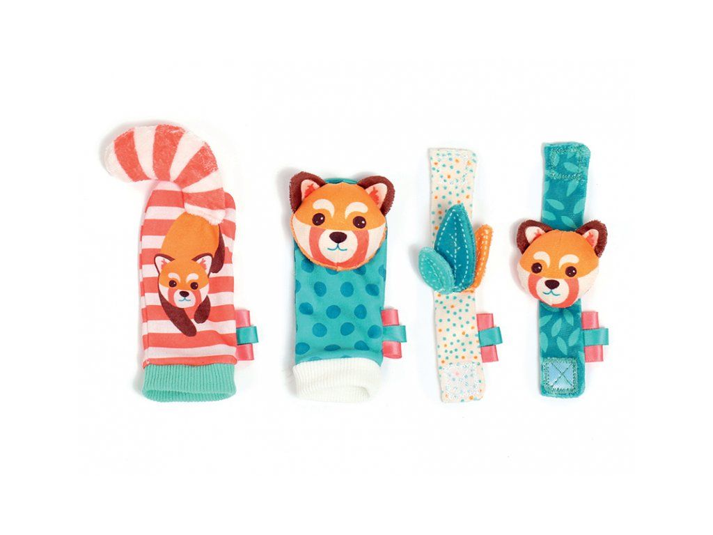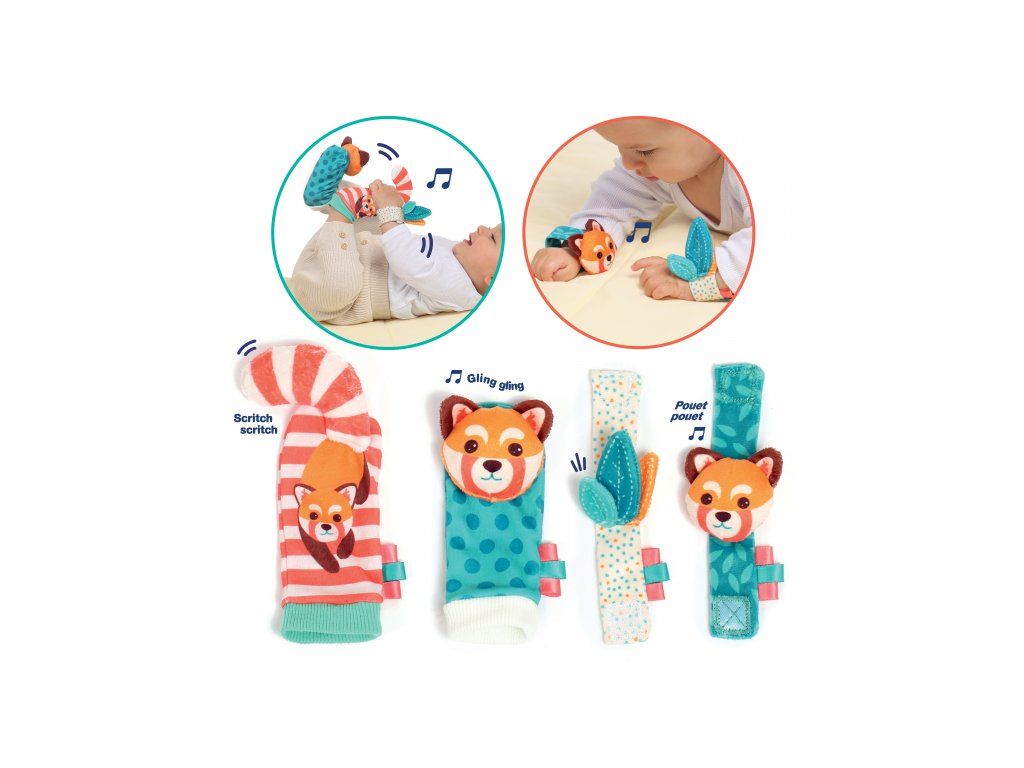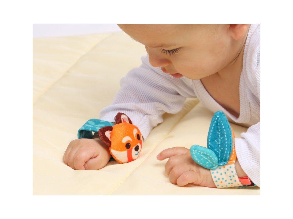 Hrkálky s veselými tvárami pandy podnecujú rozvoj sluchu, zraku a hmatu dieťaťa. Hrkálky sa ľahko pripevnia s pomocou suchého zipsu dieťaťu na zápästie a navlečú na nožičky. Dieťa sa otáča za zvukom a sleduje výrazné farby hračky. Rôznorodé textúry na skúmanie pomáhajú rozvoju hmatu.