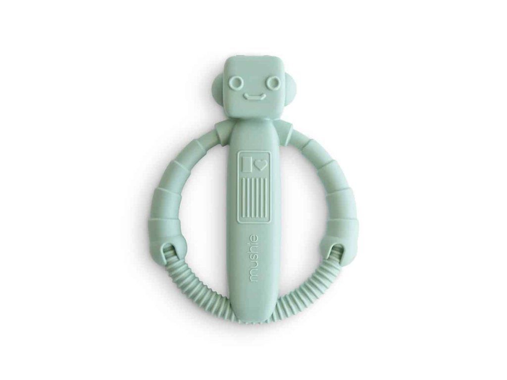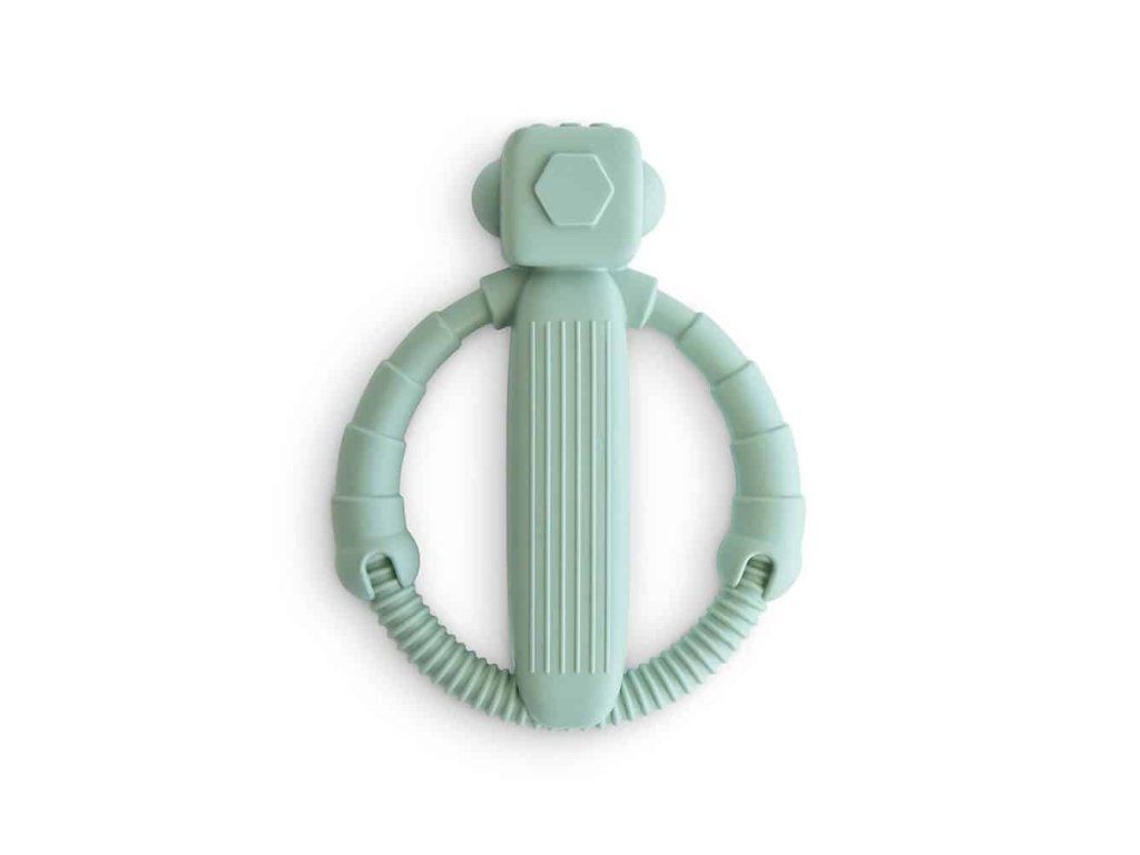 Doprajte svojim malým ratolestiam upokojujúci a zmyslový zážitok s Robotickým hrkaním od Mushie! Hryzátko, inšpirované technológiou a navrhnuté ako hravý robot, funguje aj ako hrkálka. Hryzátko nielen upokojí boľavé ďasná spôsobené prerezávaním zúbkov, ale zároveň podnieti zvedavosť detí, pretože ich zoznámi s novými zvukmi. Hrkálka Daisy je vyrobená z netoxického potravinárskeho silikónu, ktorý je úplne bezpečný na žuvanie. Hryzadlo Mushie – detaily- Odporúčaný vek: 3+ mesiace