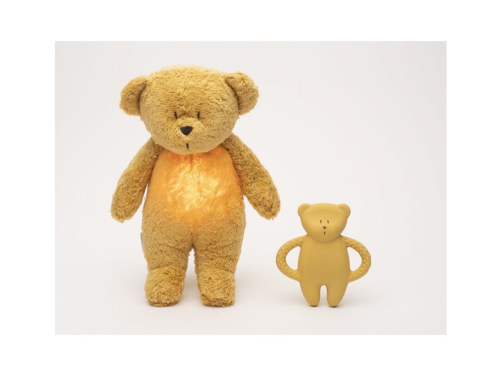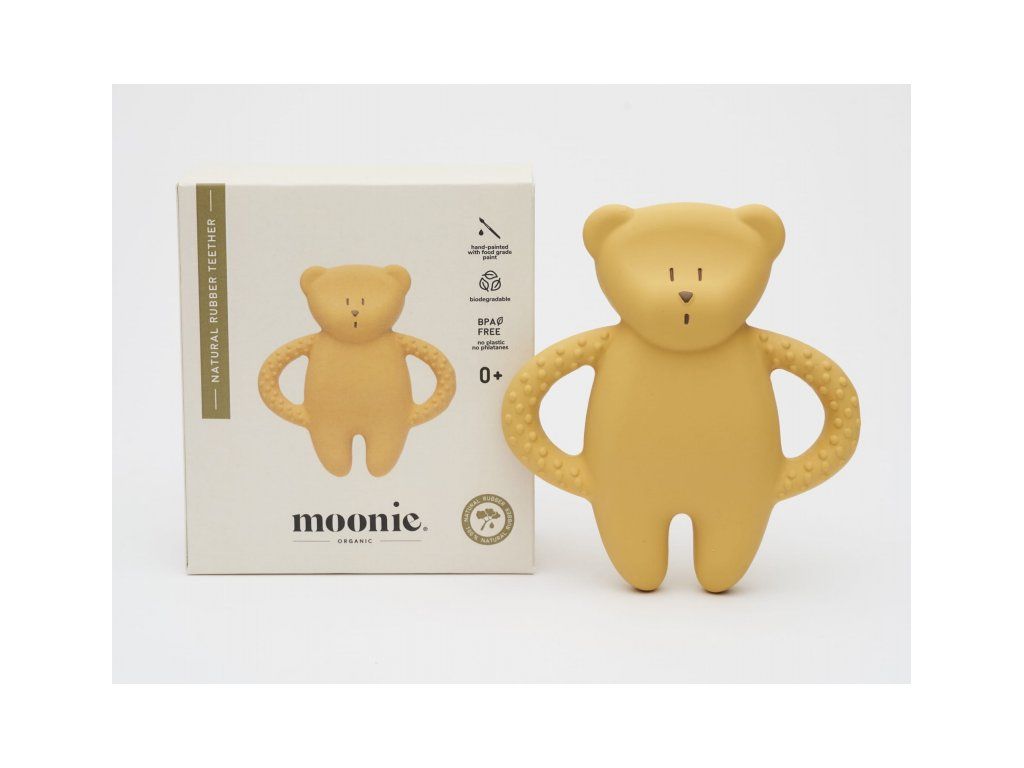 Hryzátko MOONIE v podobe rozkošného medvedíka z prírodného kaučuku bolo starostlivo navrhnuté tak, aby upokojilo boľavé ďasná počas prerezávania zúbkov a zároveň poskytovalo bezpečný a príjemný zmyslový zážitok. Tvar a veľkosť hryzátka umožňujú ľahké držanie malými detskými ručičkami, rôznorodé textúry lákajú dieťa na skúmanie. Hračka je ručne maľovaná netoxickými potravinárskymi farbami.