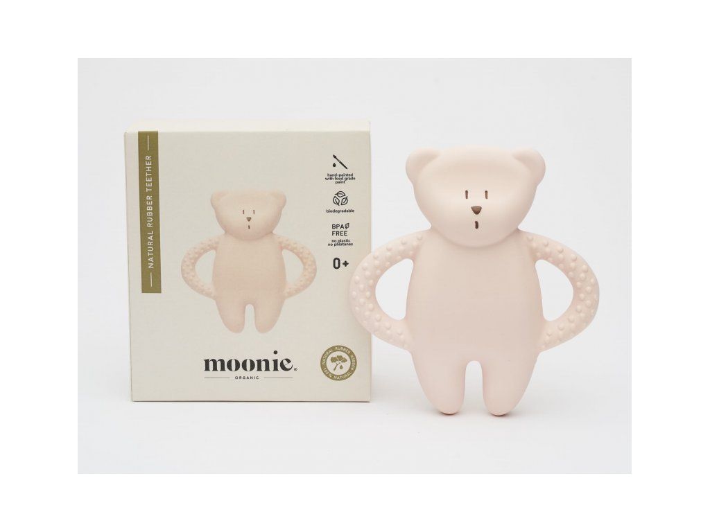 Hryzátko MOONIE v podobe rozkošného medvedíka z prírodného kaučuku bolo starostlivo navrhnuté tak, aby upokojilo boľavé ďasná počas prerezávania zúbkov a zároveň poskytovalo bezpečný a príjemný zmyslový zážitok. Tvar a veľkosť hryzátka umožňujú ľahké držanie malými detskými ručičkami, rôznorodé textúry lákajú dieťa na skúmanie. Hračka je ručne maľovaná netoxickými potravinárskymi farbami.