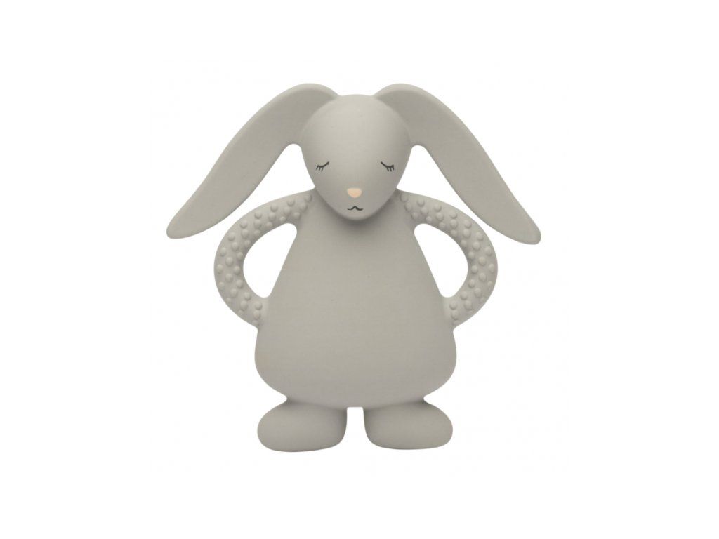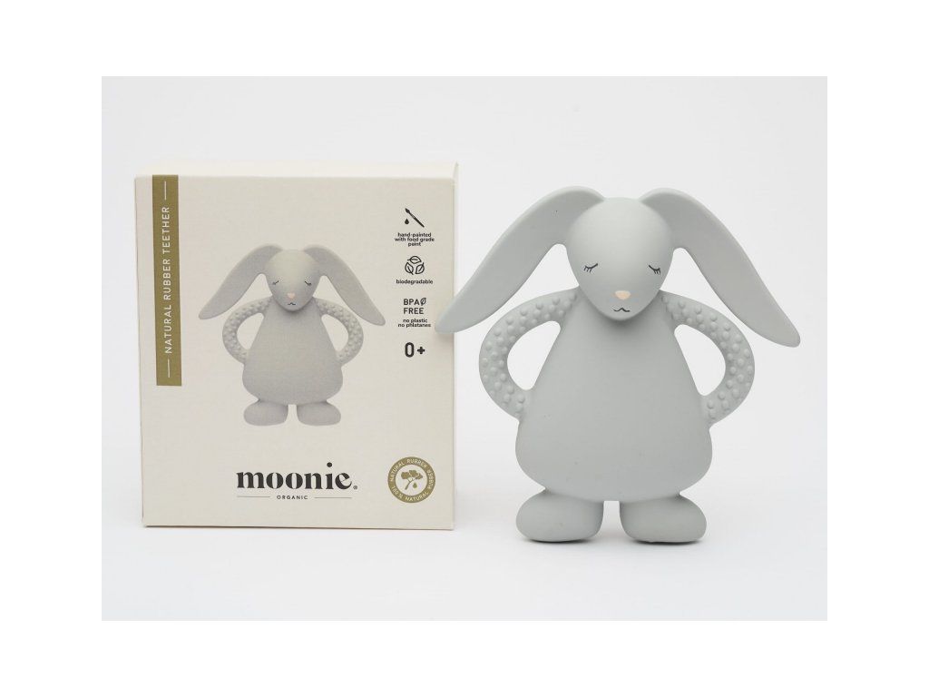 Hryzátko MOONIE v podobe nežného zajačika z prírodného kaučuku bolo starostlivo navrhnuté tak, aby upokojilo boľavé ďasná počas prerezávania zúbkov a zároveň poskytovalo bezpečný a príjemný zmyslový zážitok. Tvar a veľkosť hryzátka umožňujú ľahké držanie malými detskými ručičkami, rôznorodé textúry lákajú dieťa na skúmanie. Hračka je ručne maľovaná netoxickými potravinárskymi farbami.