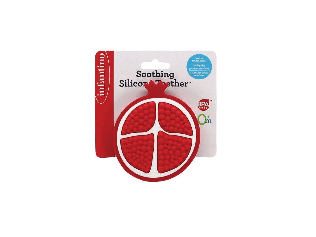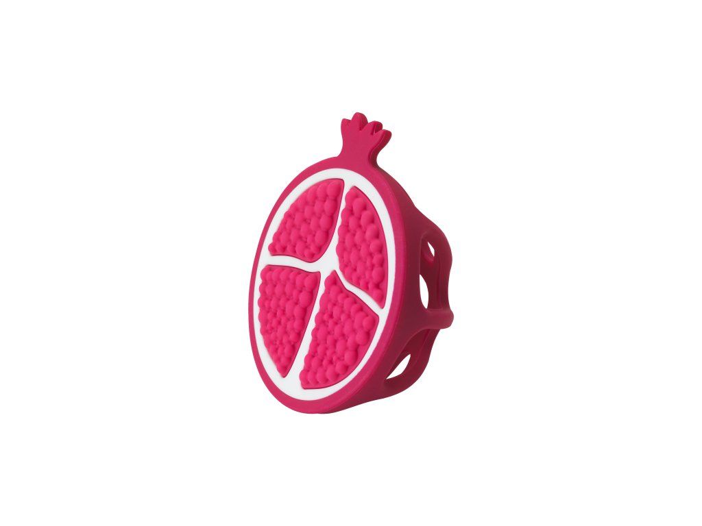 Hryzátko v podobe granátového jablka je vyrobené z jemného mäkkého silikónu. Rôznorodé textúry lákajú dieťa na skúmanie v ústach a pomáhajú tak pri prerezávaní prvých zúbkov. Ľahučké hryzátko má tvar pre ľahké uchopenie malými detskými ručičkami.