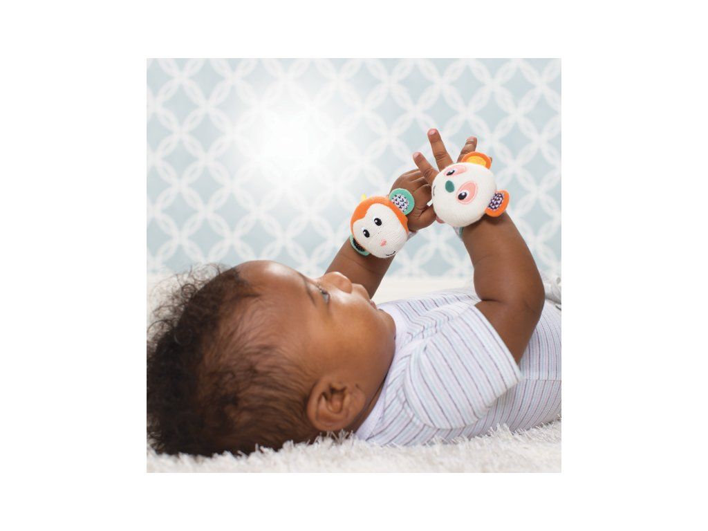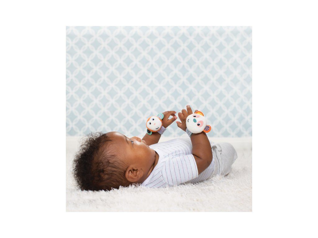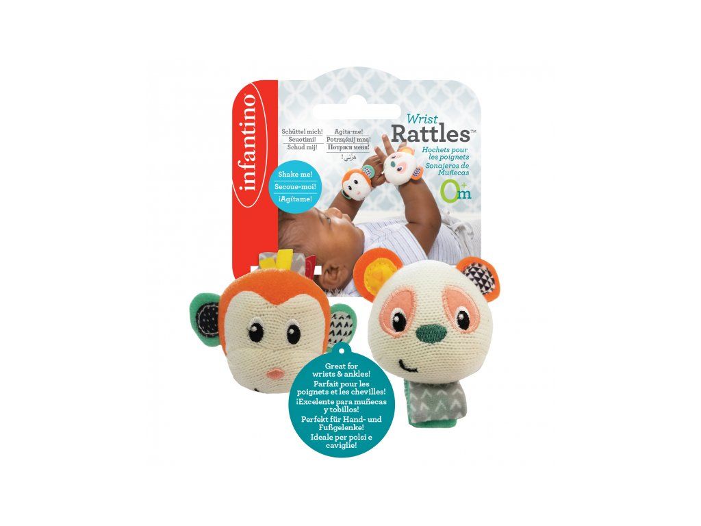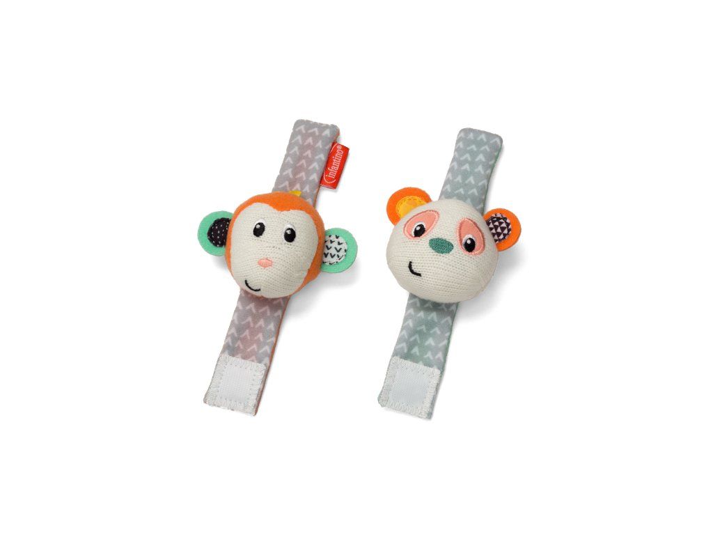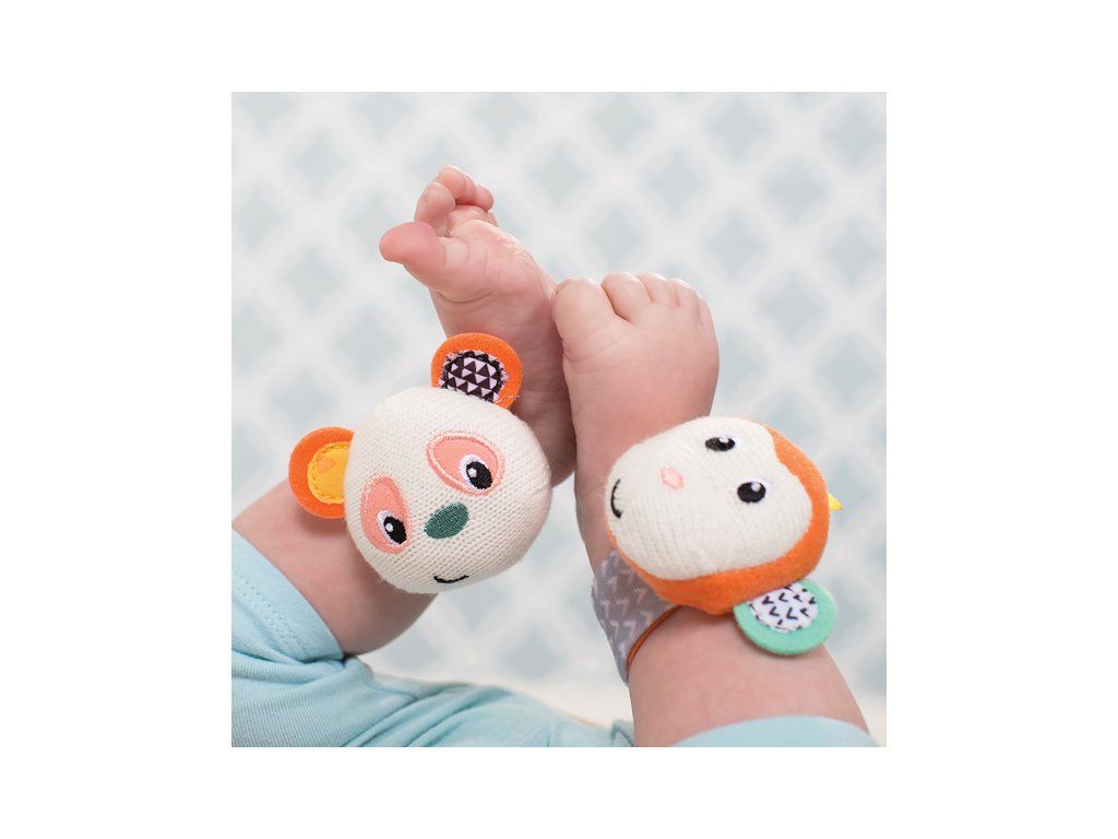 Hrkálky s veselými tvárami opičky a pandy podnecujú rozvoj sluchu, zraku a hmatu dieťaťa. Hrkálky sa ľahko pripevnia s pomocou suchého zipsu dieťaťu na zápästie (alebo v neskoršom veku na členky). Dieťa sa otáča za zvukom a sleduje výrazné farby hračky.