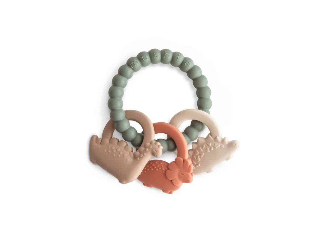 Krúžok na prerezávanie zúbkov s tromi malými dinosaurami, ktorý je navrhnutý tak, aby upokojil boľavé ďasná a poskytol úľavu pre najmenších a pokoj pre rodičov. Krúžok na prerezávanie zúbkov má rôzne tvary a textúry, ktoré stimulujú zmysly detí, kým si zaboria ďasná do mäkkého 100% potravinárskeho silikónového materiálu. Hryzátka sú v hravých dizajnoch pre každého a dodajú vášmu domovu štýlový nádych. Mushie hryzátko:- Odporúčaný vek: 3+ mesiace