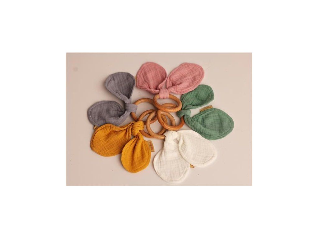 Hryzátko s mušelínovou plienkou je ideálna súprava, keď sa dieťaťu prerezávajú zúbky. Hryzátko je vyrobené z bukového dreva šetrného k životnému prostrediu a mäkkej mušelínovej tkaniny. Je úplne bezpečná pre bábätká a prináša upokojujúcu úľavu pri prerezávaní zúbkov. Hryzátko možno použiť aj ako hračku pre bábätká. Hryzátko sa dokonale hodí k našim ostatným mušelínovým výrobkom a vytvára krásnu súpravu, ktorú môžete darovať ako darček na oslavu narodenia dieťaťa.