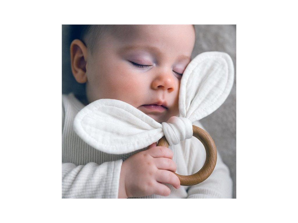 Hryzátko s mušelínovou plienkou je ideálna súprava, keď sa dieťaťu prerezávajú zúbky. Hryzátko je vyrobené z bukového dreva šetrného k životnému prostrediu a mäkkej mušelínovej tkaniny. Je úplne bezpečná pre bábätká a prináša upokojujúcu úľavu pri prerezávaní zúbkov. Hryzátko možno použiť aj ako hračku pre bábätká. Hryzátko sa dokonale hodí k našim ostatným mušelínovým výrobkom a vytvára krásnu súpravu, ktorú môžete darovať ako darček na oslavu narodenia dieťaťa.