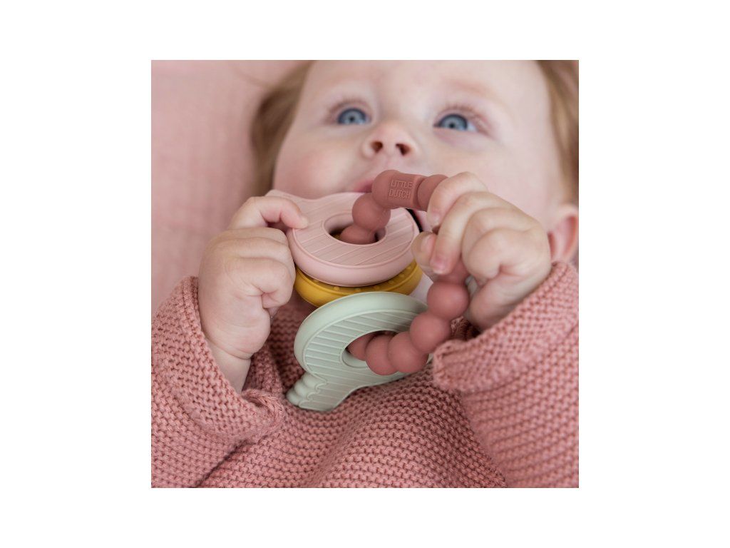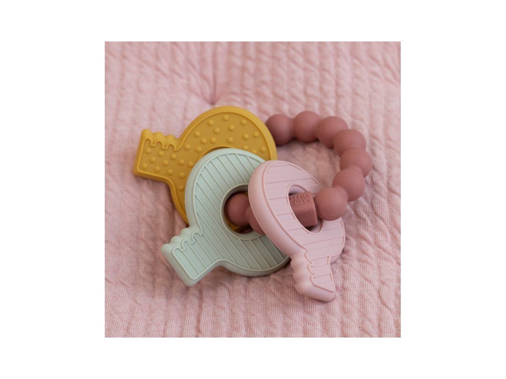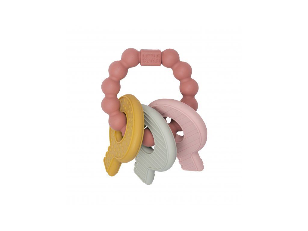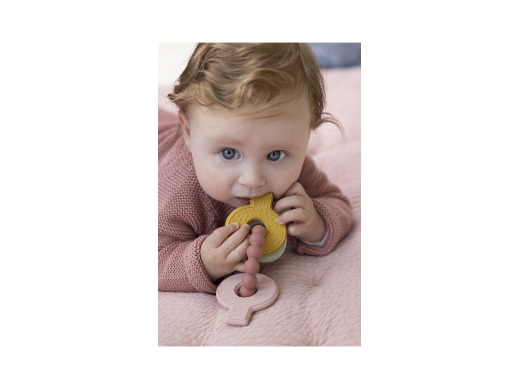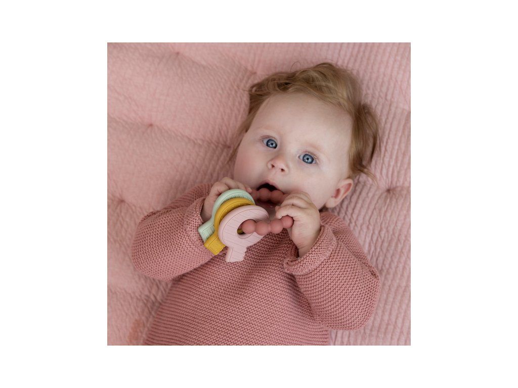 Mäkké silikónové hryzátko s rôznymi textúrami láka dieťa na skúmanie v ústach a pomáha tak pri prerezávaní prvých zúbkov. Hryzátko v podobe kľúčov na krúžku má tvar pre ľahké uchopenie detskými ručičkami.
