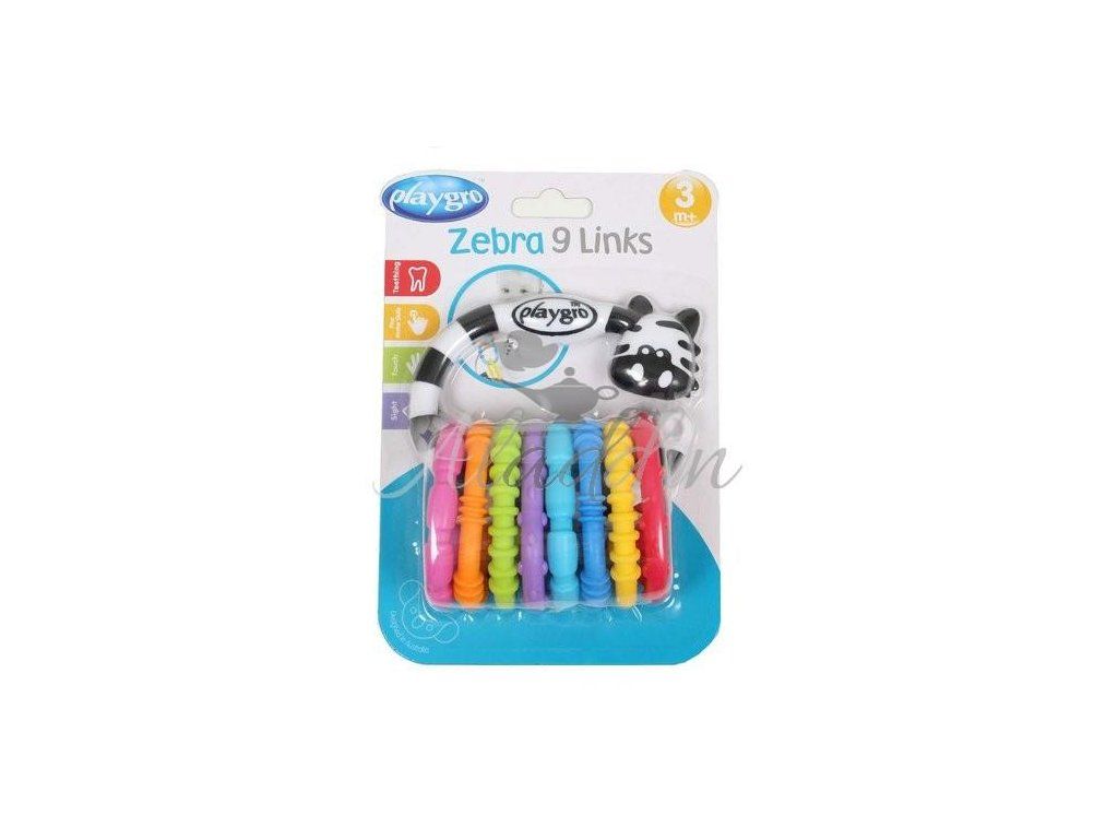 Osem farebných klipov s čiernobielou zebrou ponúka farebnú variabilitu zostavenia reťaze a pripevnenia na kočík. Zebra s krúžkami rozvíja sluch, zrak, hmat, jemnú motoriku a pomáha pri prerezávaní prvých zúbkov.