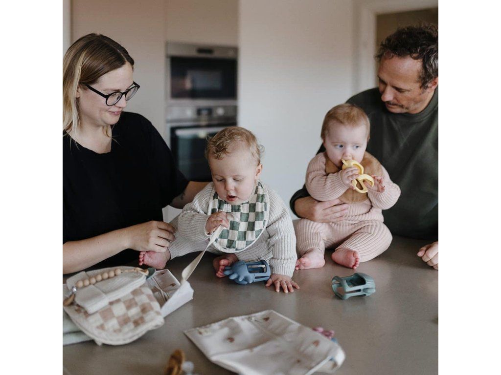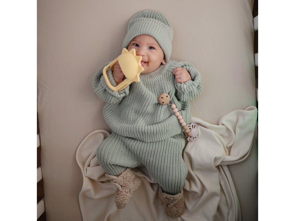 Hryzátko je vyrobené z potravinárskeho silikónu, takže je úplne bezpečné na hryzenie. Vnútorná rúčka uľahčuje uchopenie bez padania a deti si zamilujú. Skúmanie textúrovaného povrchu a mäkkých okrajov, ktoré upokojujú ďasná.