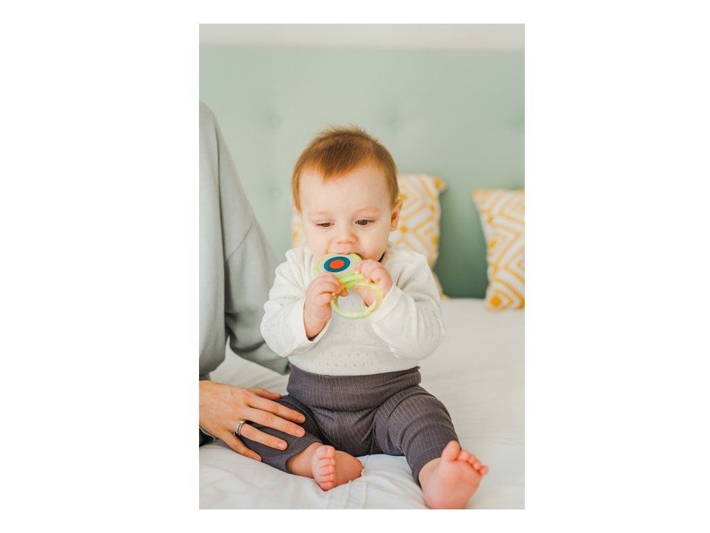 Chladiace hryzátko STEP 2 - žuvacia guma z prírodného latexu je odporúčaná pre predné zuby, a preto je vhodná pre deti od +4 mesiacov k masáži ďasien, ktoré nemajú zatiaľ zúbky prerezané. Svoju dôležitosť majú aj jemné bublinky slúžiace na masírovanie. Doprajte Vášmu bábätku pocit pokoja a bezpečia v prvých dňoch, keď sa zoznamuje so svetom. Možno sterilizovať za studena - nevyvárajte, nevystavujte hryzátko vysokým teplotám. Nevkladejte do mikrovlnéj rúry. Nemývajte v umývačke riadu.