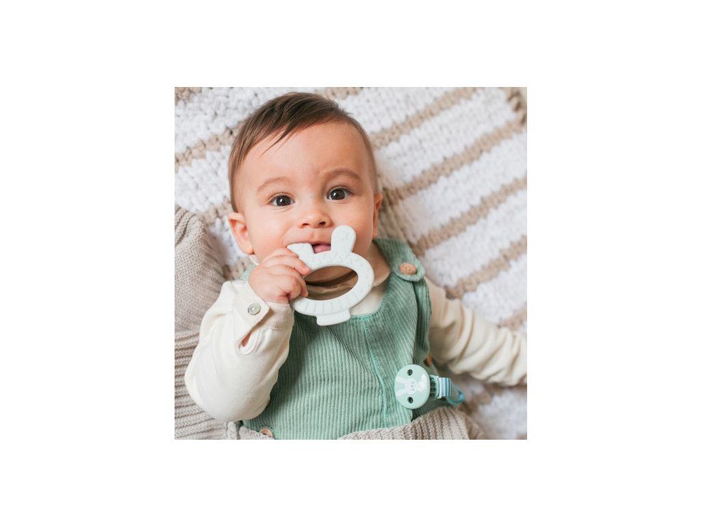 Hryzátko v tvare zajačika s drobnými výstupkami pre úľavu detských ďasien v praktickom boxe pre hygienickú prepravu. Evolučné hryzátka sú bezpečné, ergonomické, ľahké a veľmi zábavné.