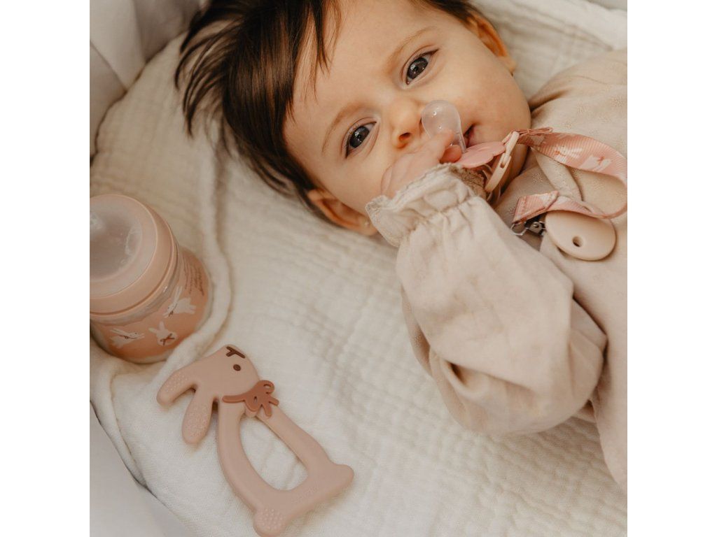 Mäkký a flexibilný silikón je šetrný k citlivým ďasnám, zatiaľ čo jemné výstupky pomáhajú uľaviť pri prerezávaní zúbkov a zároveň podporujú rozvoj jemnej motoriky.