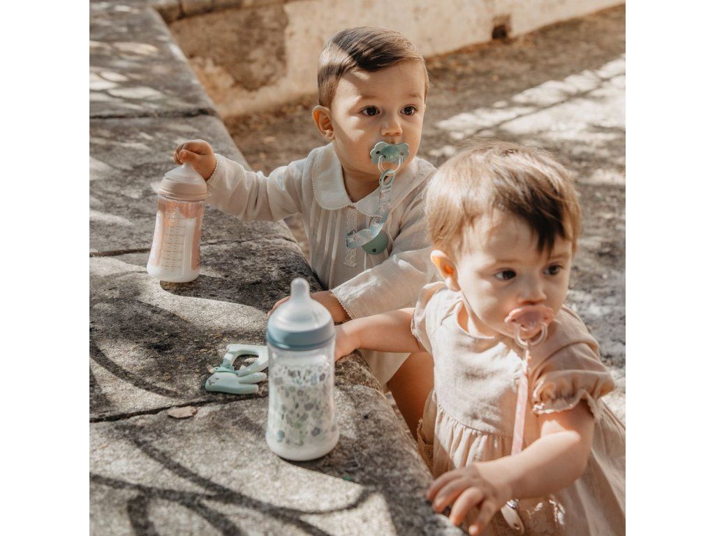 Mäkký a flexibilný silikón je šetrný k citlivým ďasnám, zatiaľ čo jemné výstupky pomáhajú uľaviť pri prerezávaní zúbkov a zároveň podporujú rozvoj jemnej motoriky.