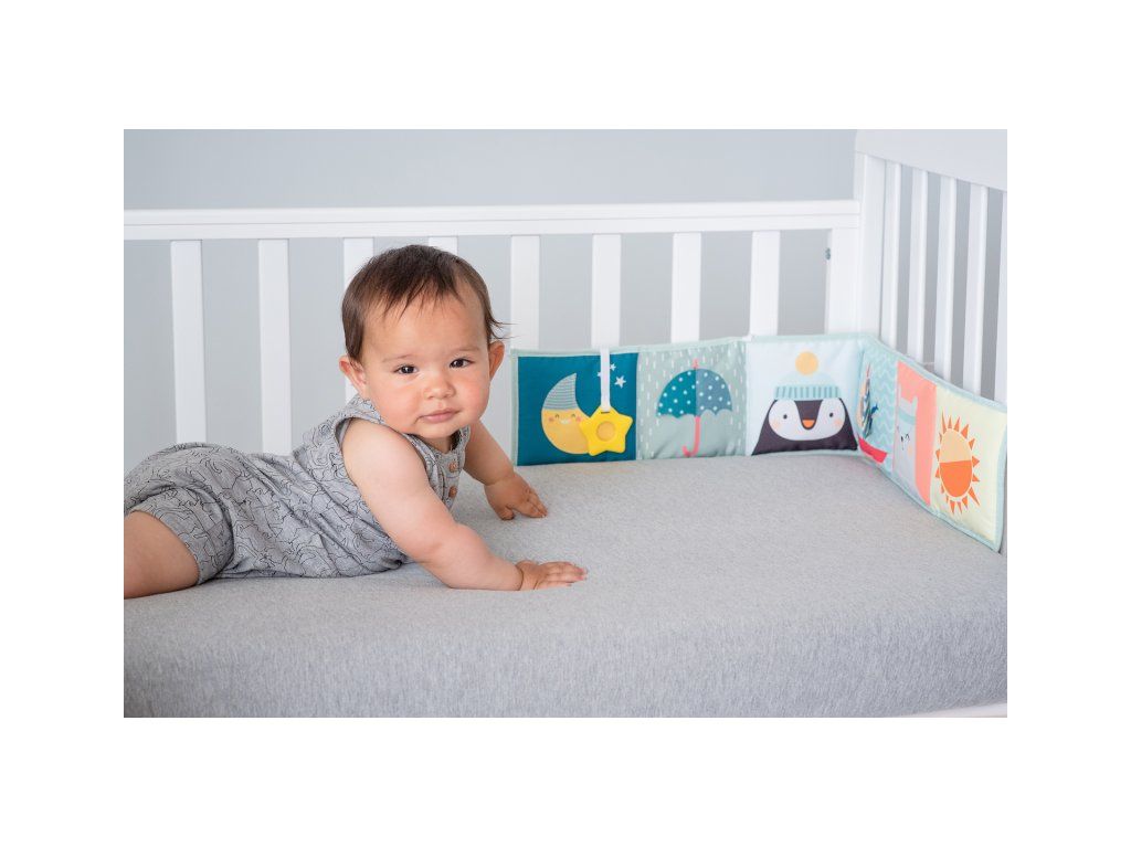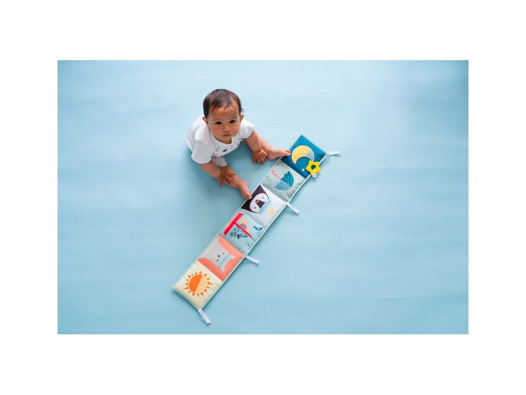 - Od 3 mesiacov: strana s farebnými obrázkami a rôznorodými textúrami na skúmanie, ktoré podporujú rozvoj zmyslov a jemnej motoriky dieťaťa.