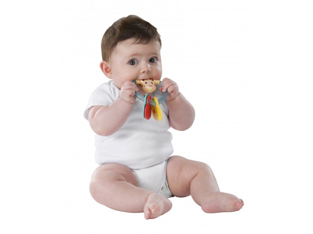 Krúžok je vyrobený z mäkkého materiálu, ktorý je ideálny na žuvanie a zmiernenie bolesti detských ďasien pri prerezávaní zúbkov.