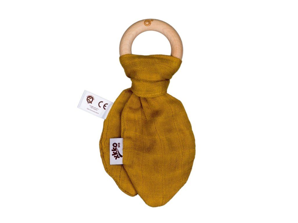 Drevené hryzátko XKKO BMB so šuštivými lístkami z extrémne jemného bambusového mušelínu. Bambusová viskóza je antibakteriálna a nespôsobuje žiadnu alergickú reakciu.