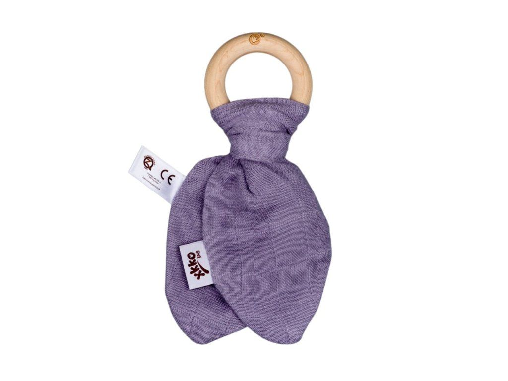 Drevené hryzátko XKKO BMB so šuštivými lístkami z extrémne jemného bambusového mušelínu. Bambusová viskóza je antibakteriálna a nespôsobuje žiadnu alergickú reakciu.