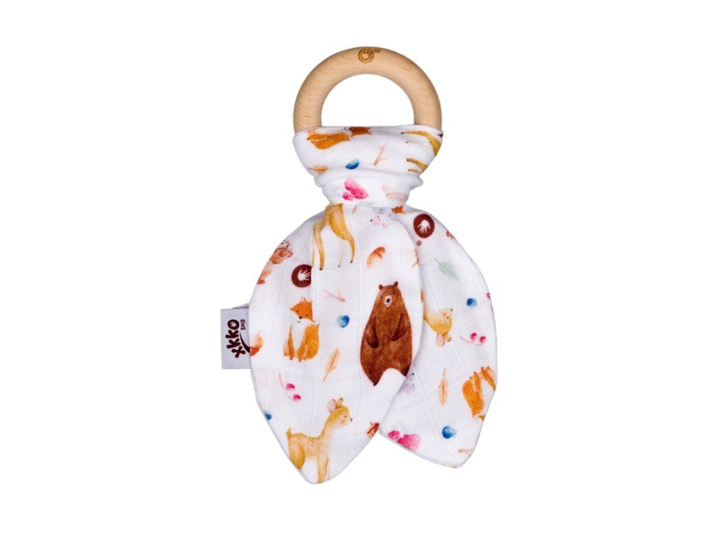 Drevené hryzátko XKKO BMB so šuštivými lístkami z extrémne jemného bambusového mušelínu. Bambusová viskóza je antibakteriálna a nespôsobuje žiadnu alergickú reakciu.