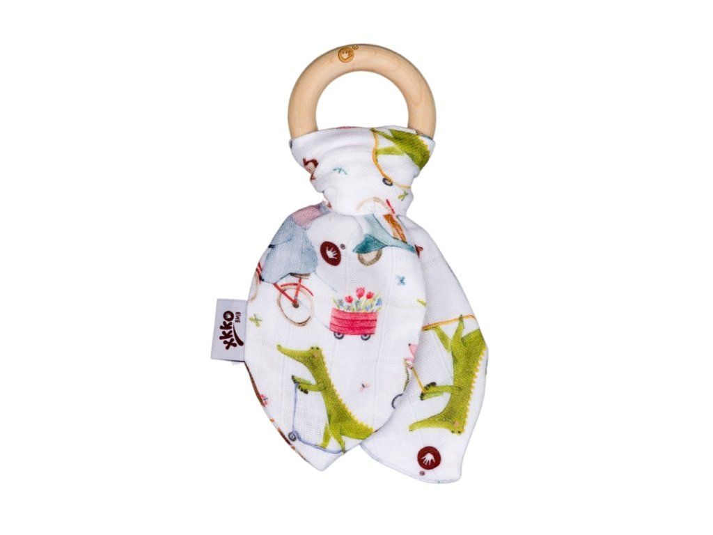 Drevené hryzátko XKKO BMB so šuštivými lístkami z extrémne jemného bambusového mušelínu. Bambusová viskóza je antibakteriálna a nespôsobuje žiadnu alergickú reakciu.