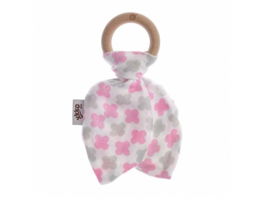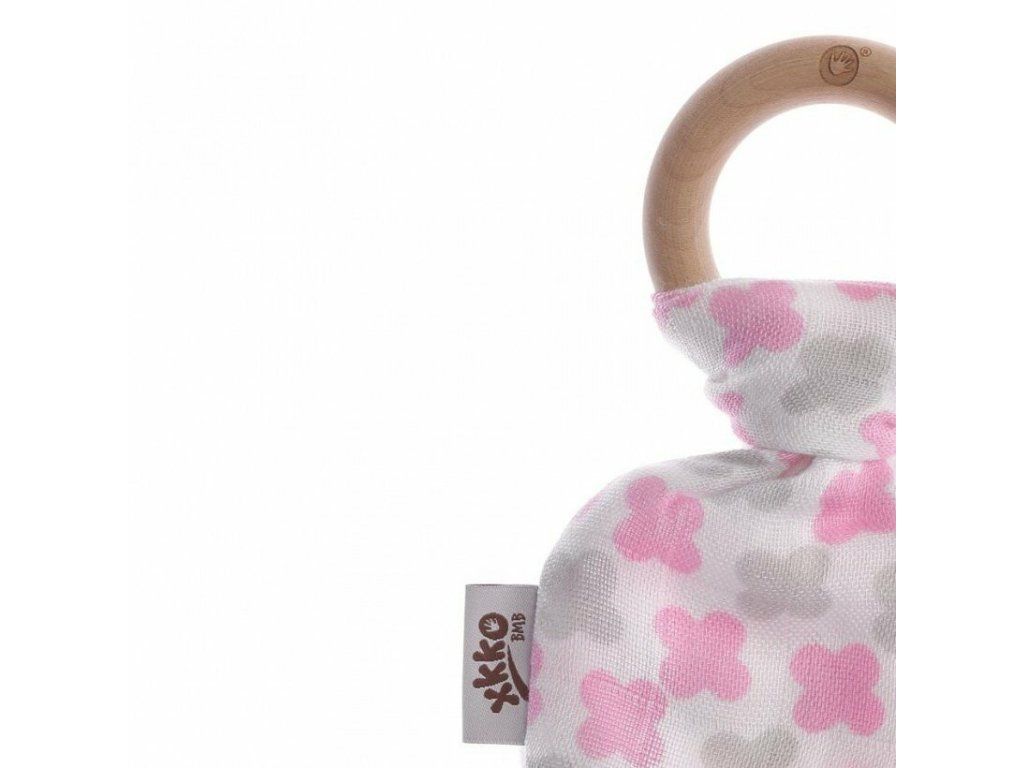 Drevené hryzátko XKKO BMB so šuštivými lístkami z extrémne jemného bambusového mušelínu. Bambusová viskóza je antibakteriálna a nespôsobuje žiadnu alergickú reakciu.